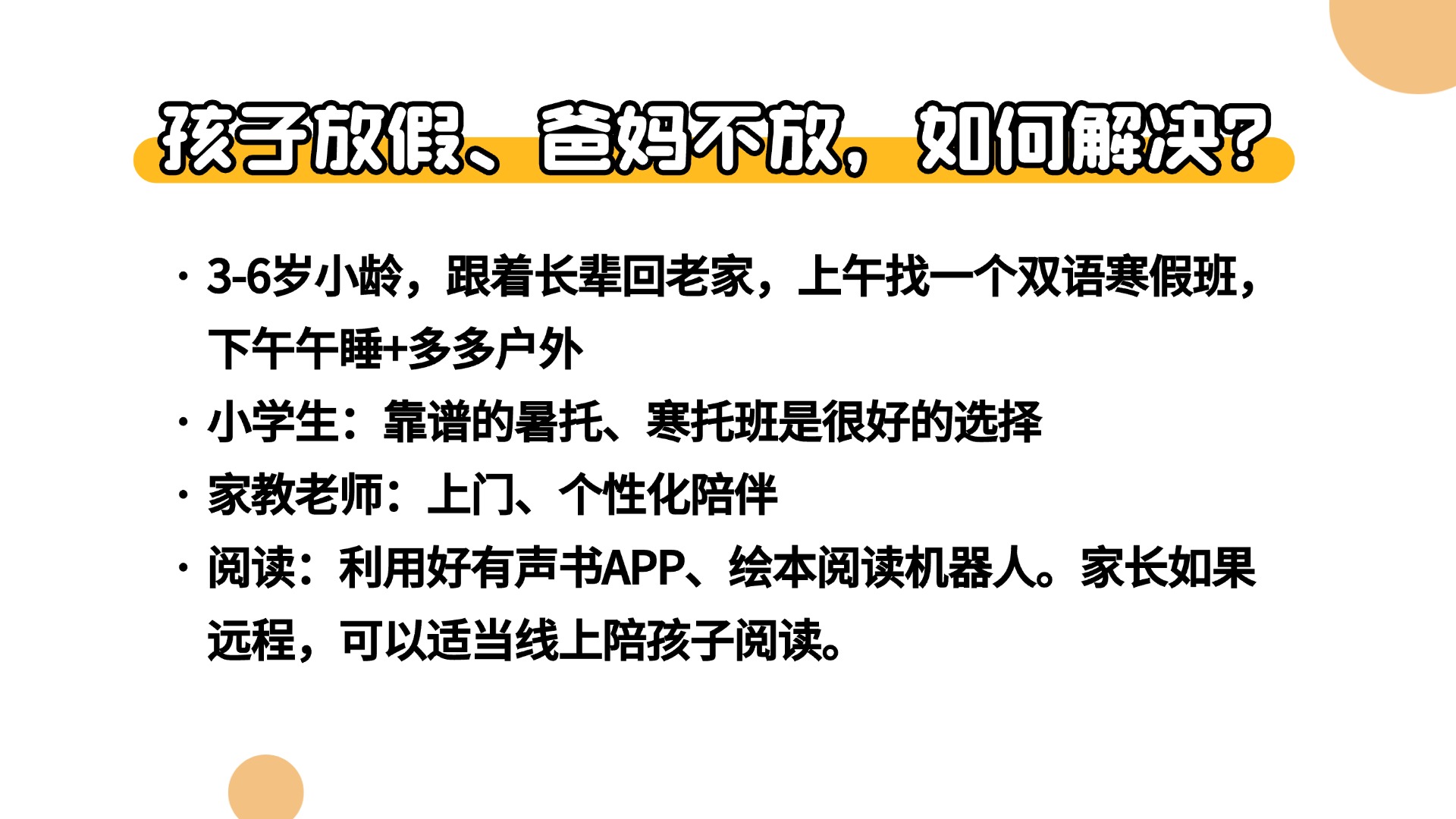 可在当地寻找性价比高的双语寒假托班,上午托管,下午由老人保证户外时间。 - 6岁以上小学生:
