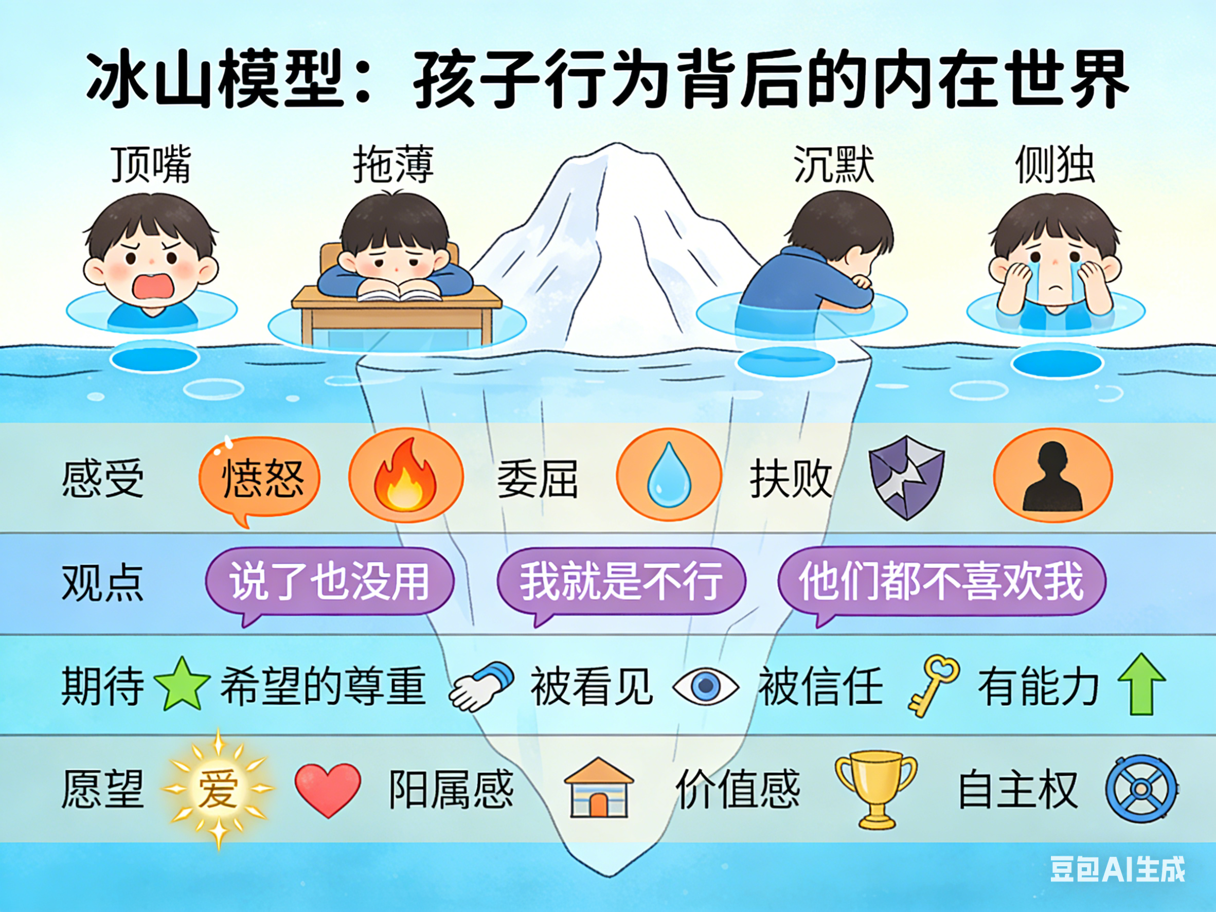 这是倾听的最高阶,也是通向解决问题的桥梁。这里,我要引入心理学中一个著名的 “冰山模型” 。我们看到的孩子顶嘴、摔门、厌学这些行为,只是露出水面的、很小的一部分。而驱使这些行为的庞大冰山主体,是隐藏在水面下的感受、观点、期待和渴望。
