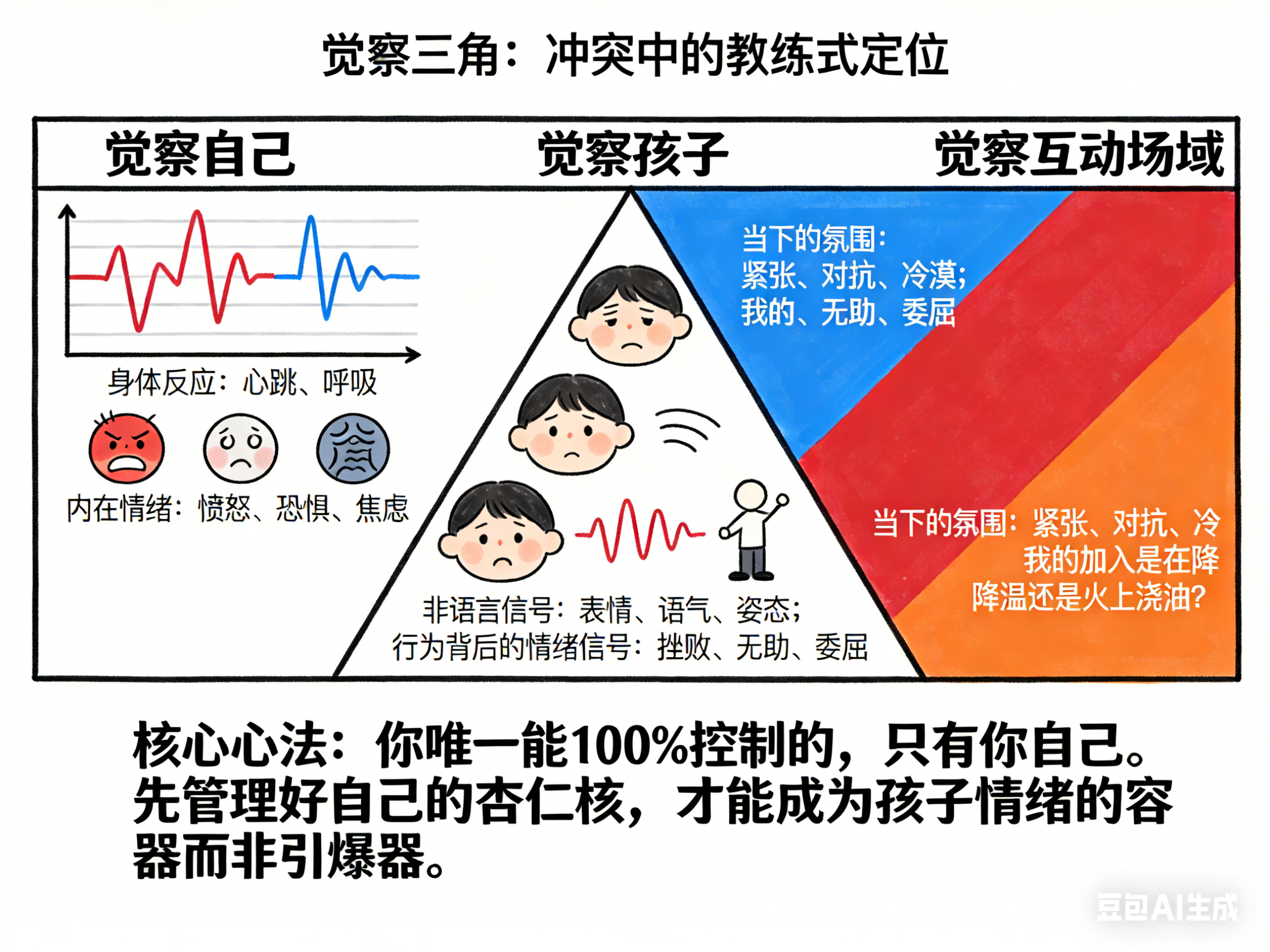 请你记住,在这个三角里,你唯一能百分百控制的,只有你自己。所以,教练式父母的第一步,不是去扑灭孩子的火,而是先管理好自己的“杏仁核”,从一个被情绪卷入的“当事人”,退后一步,回到一个相对中立、客观的 “教练状态” 。就像篮球教练不会自己冲上场去打球,而是站在场边观察、指导。先稳住自己,是一切改变的起点。