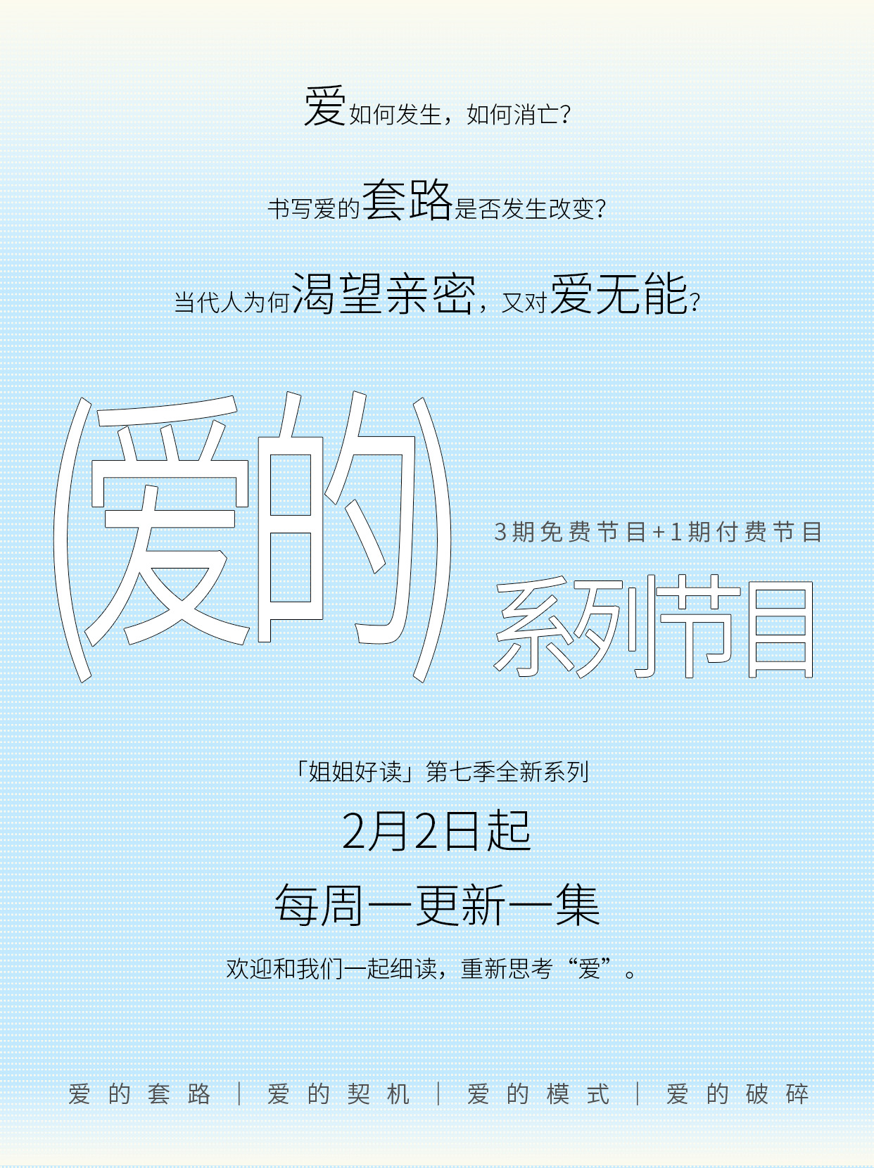 在这组「爱的……」系列里,我们会用 3 期免费节目 + 1 期付费节目,一起拆解爱的套路与模式、发生的契机,以及爱的终结。