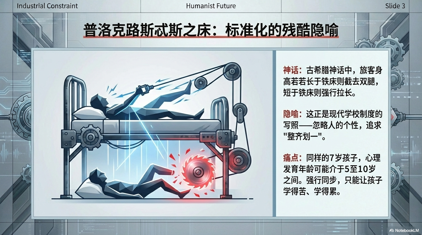 07:12 现代学校制度的局限:反思工厂化教育模式中“普洛克路斯忒斯之床”对个性的削足适履。