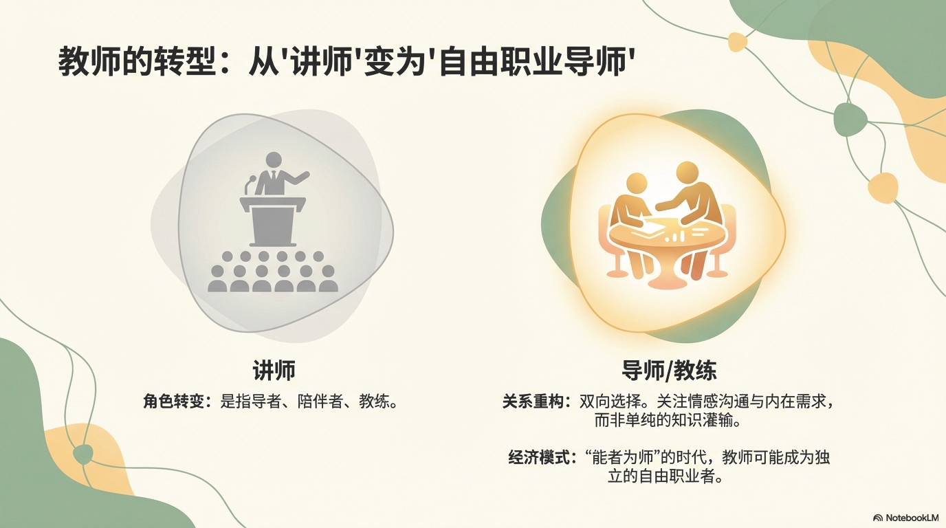 15:13 教师角色的重定义:探讨未来教师如何从“知识垄断者”转变为自由职业的陪伴者与教练。