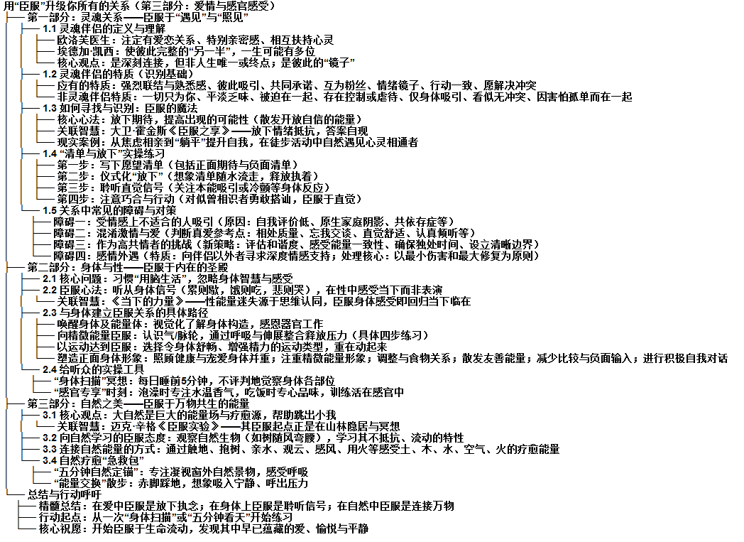 爱,身体健康,大自然,这三者是我们每个人这一生里都无法逃避的课题。本期是《臣服的力量》这本书的第三期,欧洛芙医生在第三大章的关系、爱和感官感受,就重点为我们展示了这三个部分。通过这一章节的内容,我们能了解到爱可以是家人之爱、恋人之爱、朋友之爱、同事之爱,而我们究其一生寻找的那个灵魂伴侣她不一定是恋人,也可能是我们的家人、朋友和同事。关于我们的身体呢,有有形的24小时不停运作的器官,也有接近无形的精微能量,中医上则称之为“气”,当我们足够关心自己的身体,你会发现它能通过各种反应来与你对话,如果我们想要无忧无虑、精力充沛地去追逐我们的梦想,那和我们的身体和谐共处就是关键。如果我们在人生的道路上遇到困扰导致我们精疲力竭,那大自然会是你最好的伴侣,世间万物都是有生命有磁场的,我们不妨把自己置身于他们其中,感受花草树木、阳光、风、云、土、火、流水等能量,你会发现你的一切都将被慢慢疗愈。不执著,是臣服的关键,敢于接受,是臣服的核心。本期会带着你一起去深度了解人和人的关系、和自己身体的关系、以及和大自然的关系,让我们臣服地去经营这三者关系,一起无忧奔赴这片广阔的天地。