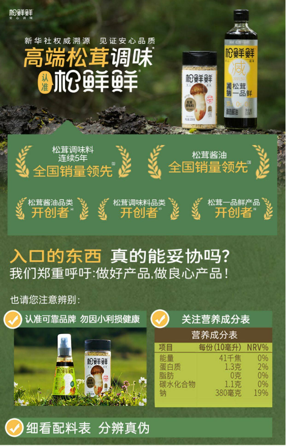 松鲜鲜,一家2020年创立的健康调味品牌,全线产品生产过程不额外添加化学提鲜剂、不添加白砂糖和多余添加剂,坚持减钠、控糖、成分自然的健康理念。作为松茸调味料品类开创者、连续5年全国销量第一。品类主要涵盖松茸调味料、酱油、蚝油、复合调味汁四大类,为中国家庭提供健康且好吃的减钠调味解决方案。