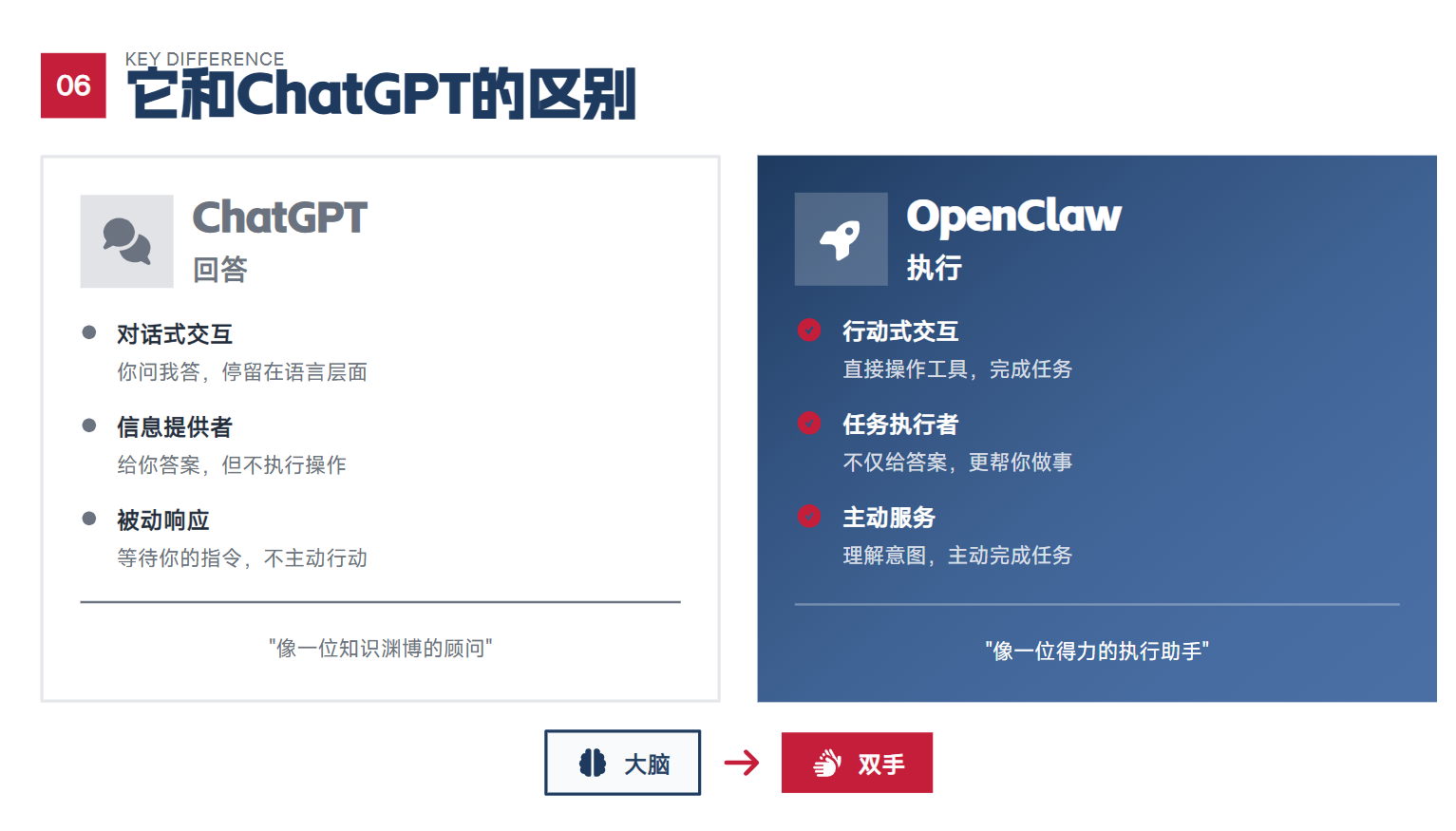 图表1:AI发展关键时间线(研报02部分),清晰呈现两次核心跃迁:2023年ChatGPT横空出世,将AI对话能力拉至人类水平,但仅停留在“说”的层面;2026年OpenClaw打破局限,实现“做”的突破。类比2007年iPhone重新定义手机,OpenClaw正将AI从聊天工具转化为执行助手,完成从“大脑”到“双手”的进化,成为AI发展的重要里程碑。