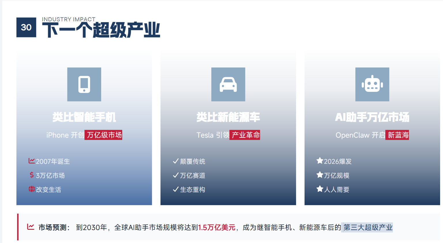 图表4:全球AI助手市场规模预测(研报30部分),揭示产业潜力:参考智能手机(2007年诞生,催生3万亿市场)、新能源车的产业革命路径,OpenClaw开启的AI助手赛道,预计2030年全球规模将达1.5万亿美元,成为继前两大产业后的第三大超级产业,呈现“人人需要、生态重构”的爆发特征。