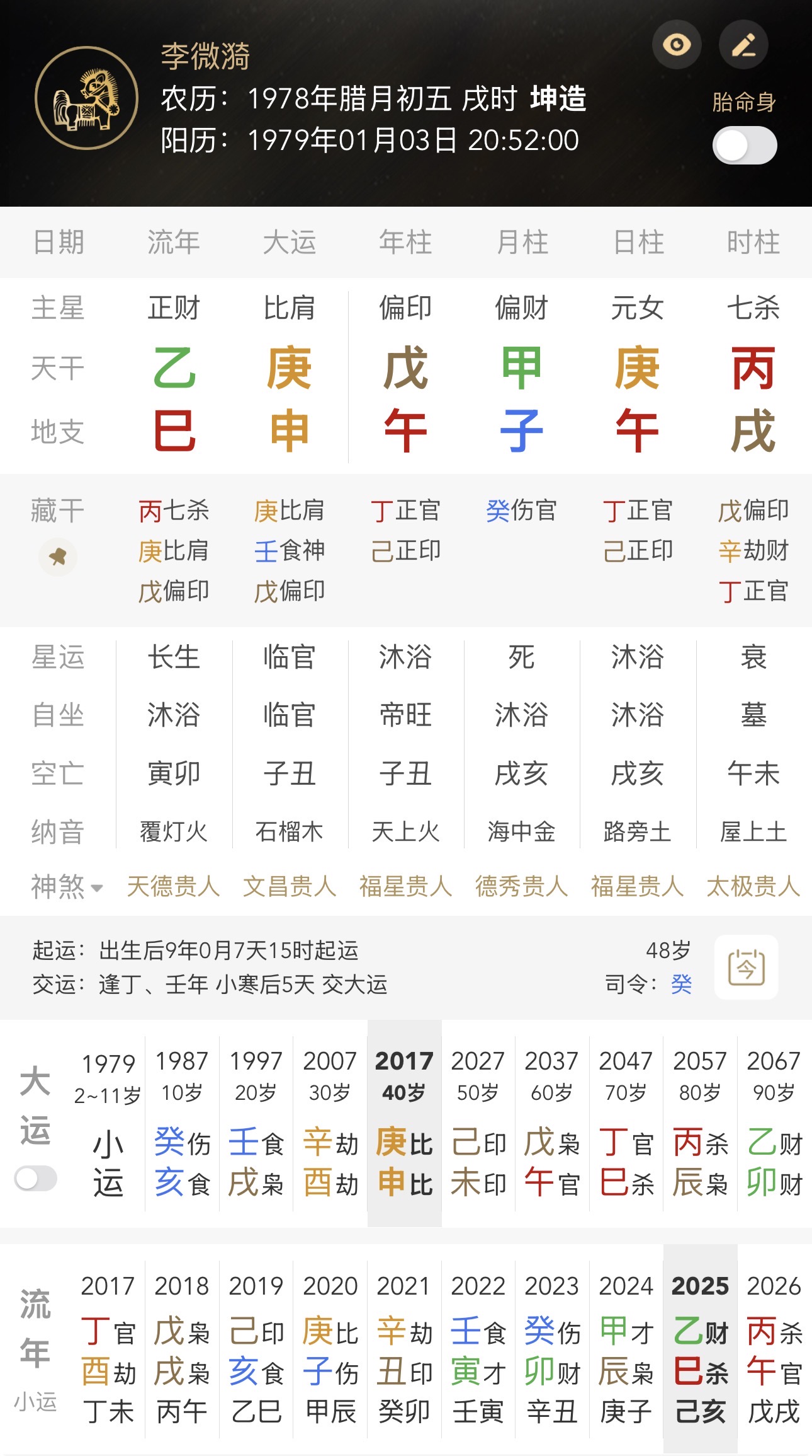 李微漪,本名龚敬,1979年1月3日(农历戊午年冬月初五)出生于四川成都,是画家、作家,也是狼生态保护者。(八字排盘:戊午 甲子 庚午 XX, 9岁起运,大运:癸亥、壬戌、辛酉、庚申、己未…)时柱暂时反推 为 乙巳 或是丙戌