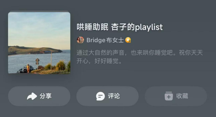 最近建了这个歌单,收集来自万物的声音,自己也被抚平,非常助眠。在网易云搜索《哄睡助眠 杏子的playlist》就可以找到。