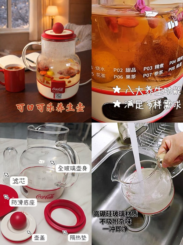 最近我的养生小物件就是这款可口可乐养生壶,让我告别喝外面小店的果茶奶茶,直接用养生壶自制健康好喝的热饮!壶身透明,茶水香味飘逸,还能做甜品、果茶等等,性价比很高!能满足各种需求: