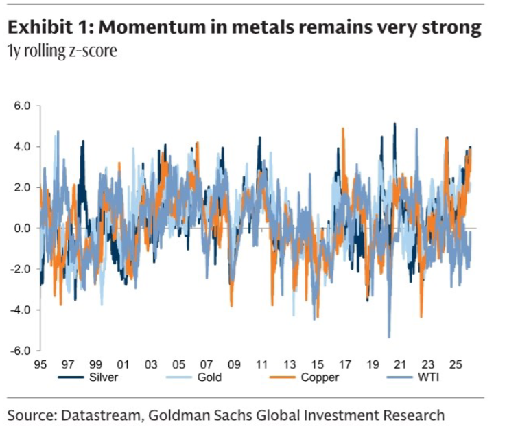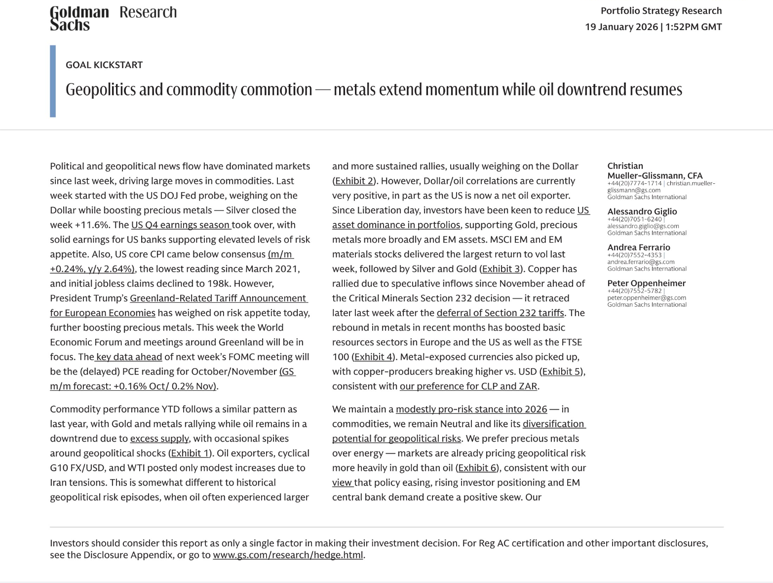 高盛2026年1月19日发布的《GOAL KICKSTART:Geopolitics and commodity commotion — metals extend momentum while oil downtrend resumes》研报显示,地缘政治事件成为市场核心驱动力,大宗商品呈现“金属强、石油弱”的鲜明分化,跨资产配置逻辑已发生显著转变。