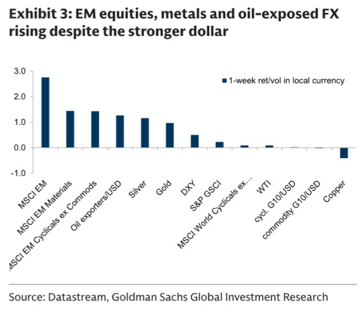 跨资产表现方面,研报第2页的Exhibit 3“EM股市、金属及石油相关外汇表现图”显示,即便美元走强,MSCI新兴市场指数、新兴市场材料股仍实现最高风险调整回报,白银、黄金紧随其后,而石油出口国货币、G10周期货币仅录得小幅上涨,凸显资金对金属及新兴市场资产的偏好。研报第3页的Exhibit 6“地缘政治风险定价图”则揭示,市场对黄金的地缘风险定价远高于石油,1个月内黄金出现超过1个标准差波动的概率显著更高,与高盛“偏好贵金属而非能源”的观点一致。
