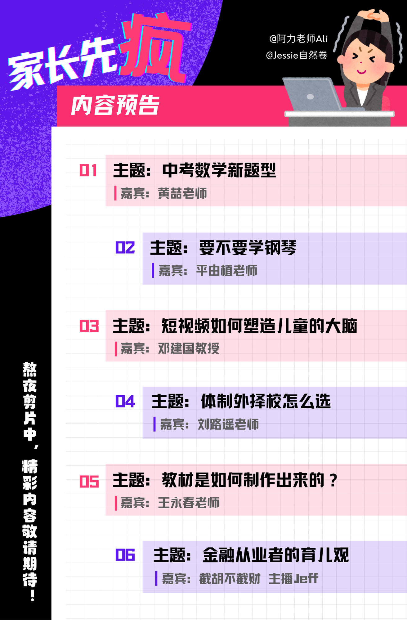 视频号:@阿力上哪学,@家长先疯,@Jessie自然卷