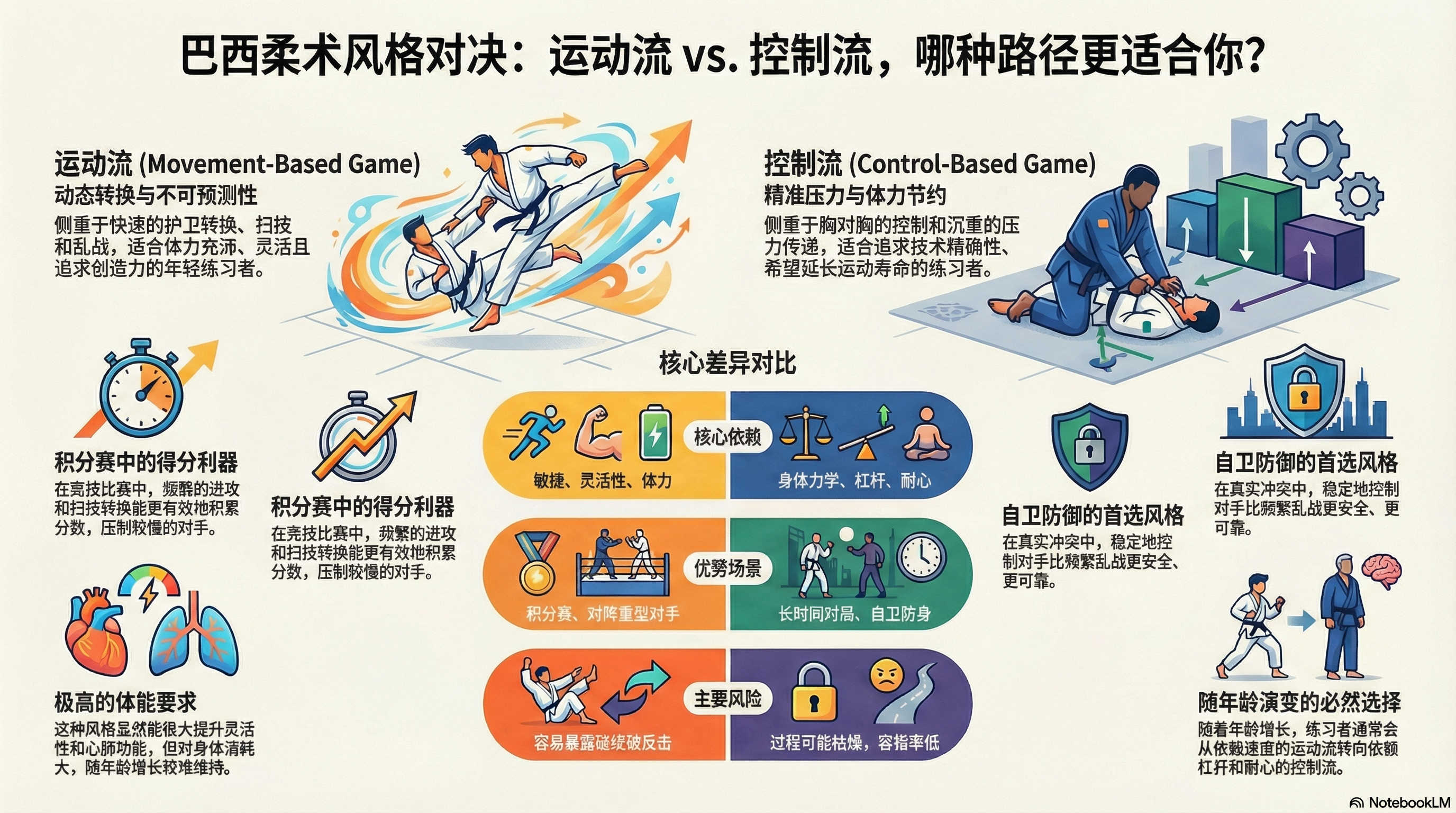 优势劣势培养身体的流动性和适应能力能量消耗巨大,随着年龄增长难以维持显著提升心肺功能和身体素质乱战中容易暴露破绽,遭到反击拥有更广泛的降服入口和技术选择对精神集中度要求极高,一次失误即可导致失位或被降服