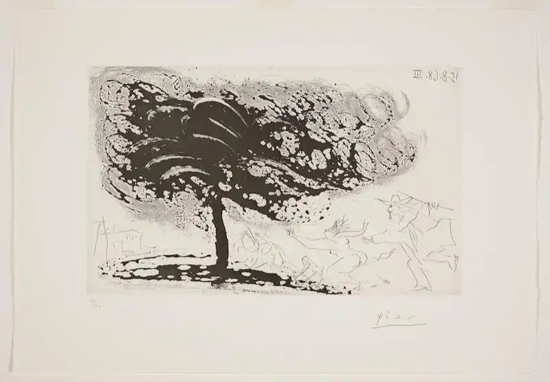 毕加索,《风暴中的树,人们逃往教堂》来自《347系列》,糖水蚀刻、干针版画,1968年