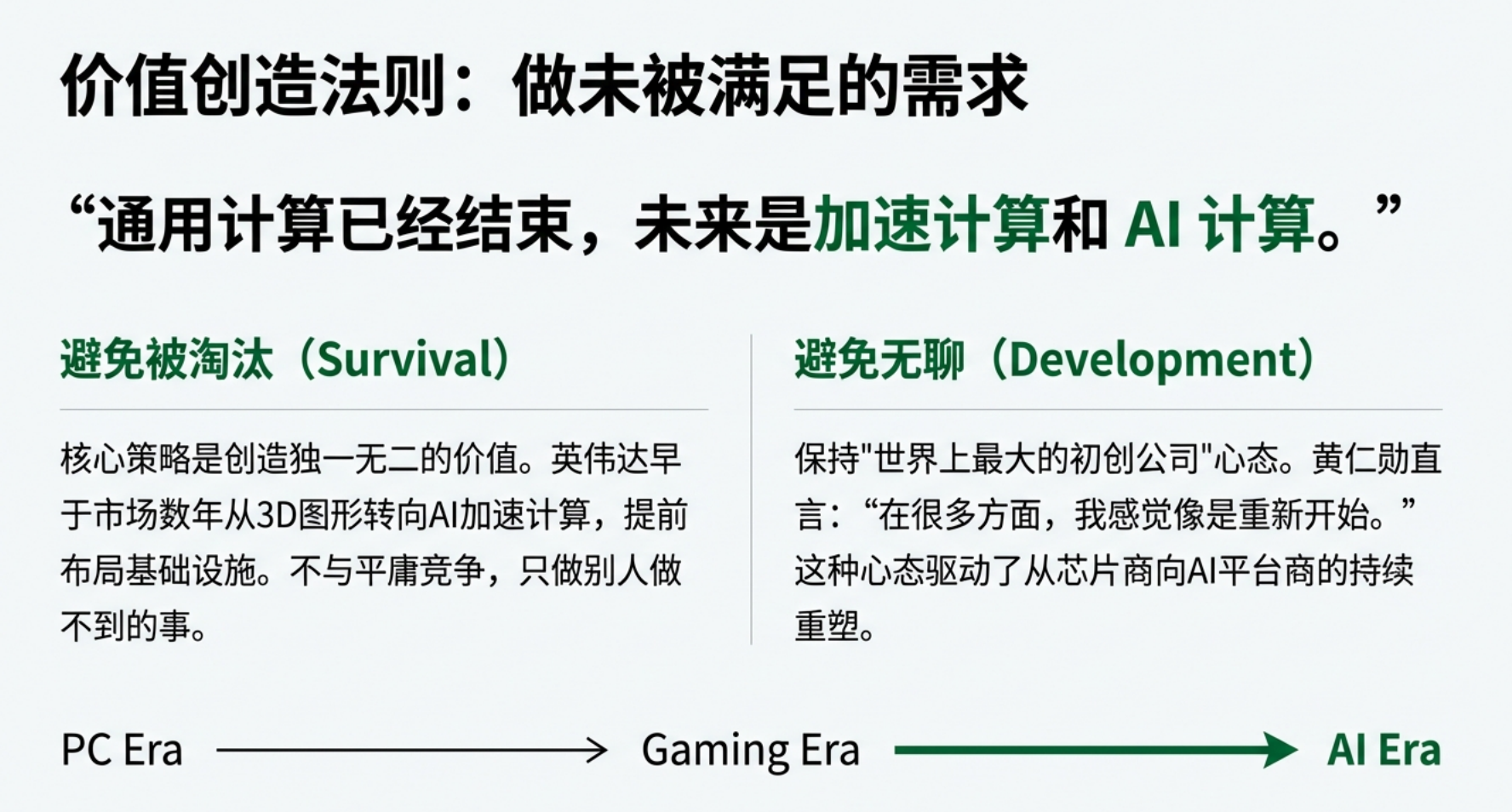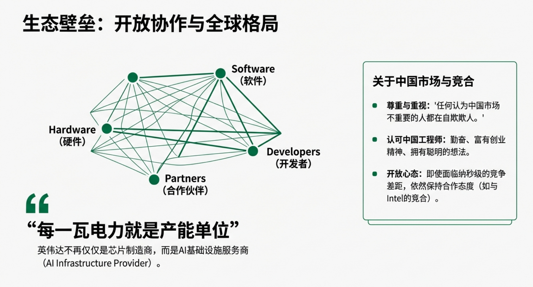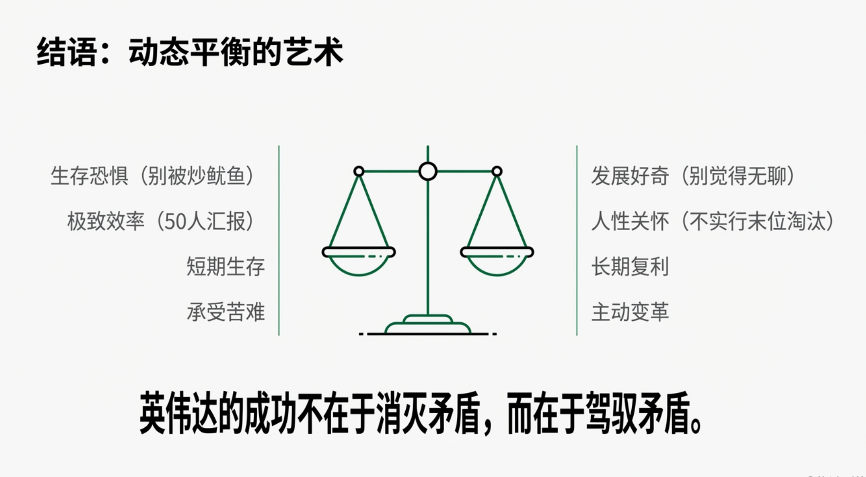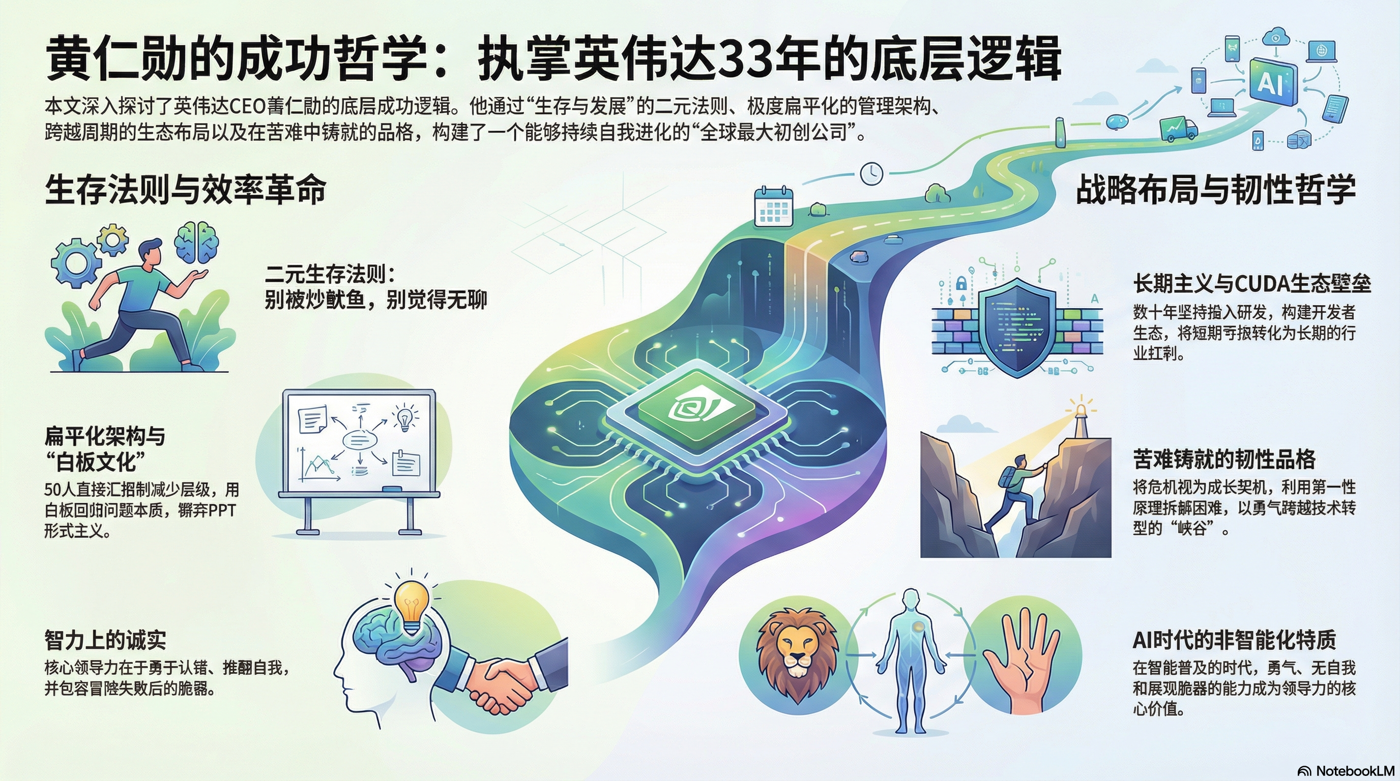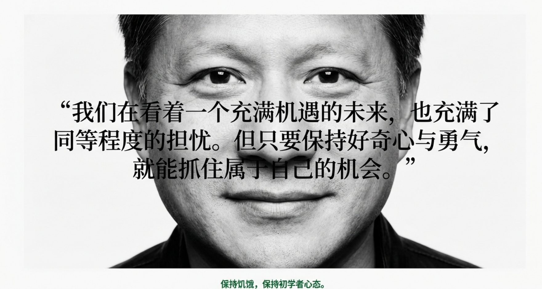 纵观黄仁勋 33 年的创业与领导生涯,其成功哲学的核心是一系列辩证平衡:在生存与发展之间,坚持“别被炒鱿鱼” 与 “别觉得无聊” 的统一;在管理中,平衡效率与人性,以扁平化架构释放潜能;在战略上,平衡短期利益与长期价值,以生态构建实现复利;在危机中,平衡韧性与变革,以苦难铸就品格;在时代变革中,平衡技术创新与人文坚守,以品格价值应对智能普及。这些平衡并非静态的妥协,而是动态的优化正如他所说:“我们都在看着一个充满机遇的未来,也充满了同