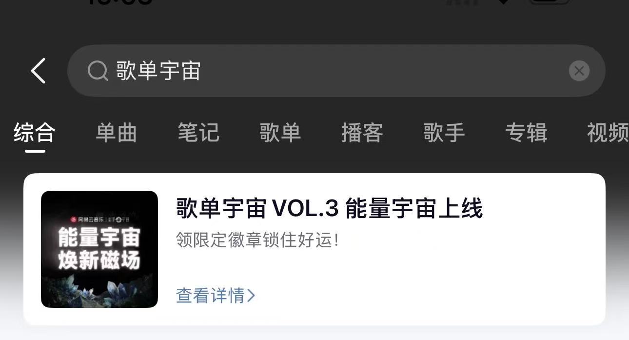 除了这些,网易云最近的“歌单宇宙”活动也很好玩,不用陷入选歌纠结,直接根据现在的心情和能量状态找到适合的歌单。可以去搜索“歌单宇宙”,收听15首歌曲就可以领到酷炫的【能量宇宙】限定徽章,也算是给认真生活的自己一个小小奖励。