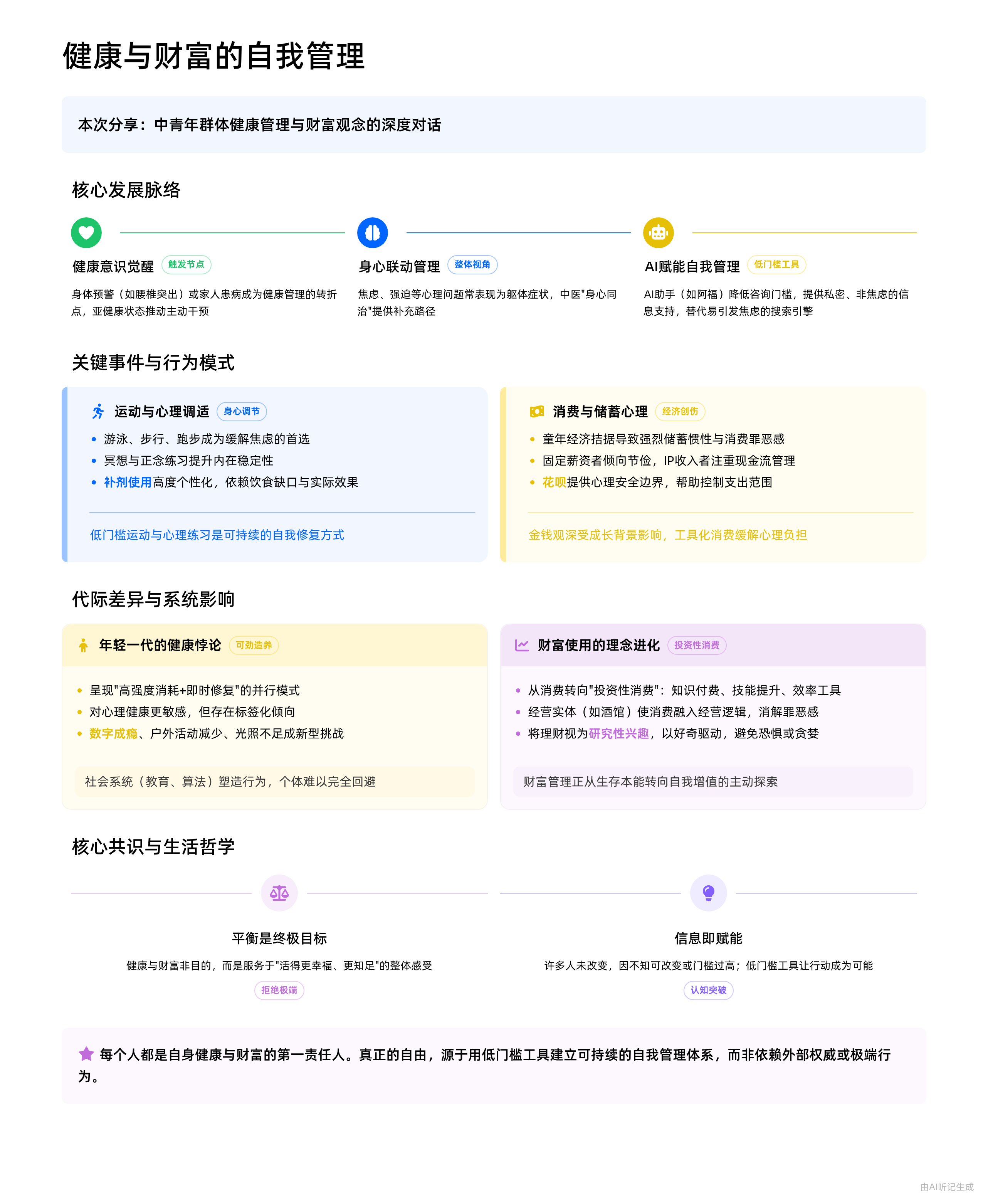 1. 健康层面:① 身心联动是关键,很多身体不适源于心理焦虑,“被看见、被理解”比单纯治病更重要;② 当代人多处于“健康中间态”,需综合体检、生活方式、饮食运动等管理身体,AI工具可降低健康咨询的心理与时间门槛;③ 中医的整体论值得认可,能兼顾身体与情绪疗愈;④ 代际健康差异明显,00后低能量、高焦虑,与环境、压力相关,上一代人则多回避心理问题。