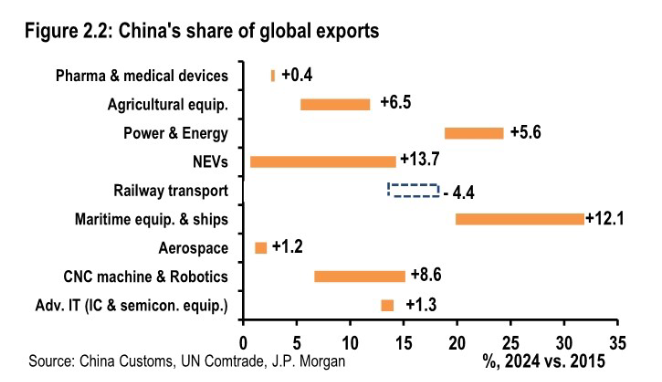 高端制造是“十五五”核心抓手,图2.2(研报第4页)对比2015-2024年中国全球出口份额变化,新能源汽车(+13.7%)、船舶(+12.1%)、工业机器人(+8.6%)等领域增长迅猛,而航空航天(+1.2%)、医药设备(+0.4%)进展缓慢。这印证了研报判断:中国在绿色 tech、重工业已形成全球优势,但高端半导体、精密制造仍受技术封锁,稀土加工垄断也面临全球产能分流挑战。