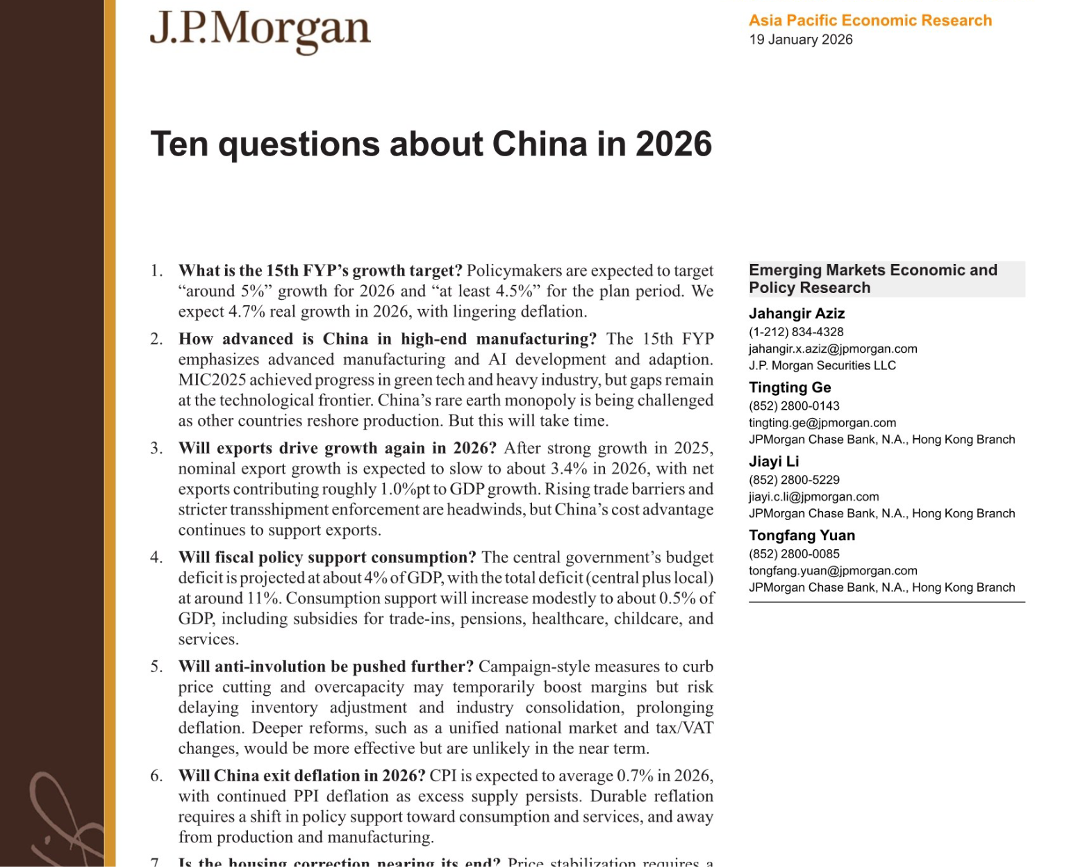 摩根大通2026年1月19日发布的《中国2026年十大问题》研报,拆解了“十五五”开局之年的核心经济逻辑:目标锚定“约5%”,实际增速预计4.7%,在高端制造、出口撑盘的同时,通缩、房地产调整等压力仍将持续,政策聚焦“高质量增长+需求端温和发力”。