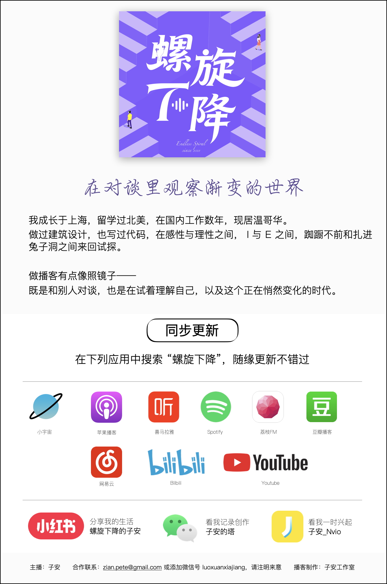 大家好,目前螺旋下降每集的制作都由我独自完成,从约嘉宾到录制,从后期到发布,至少需要10小时。(好吧,这集比较短,花了6小时😏)
