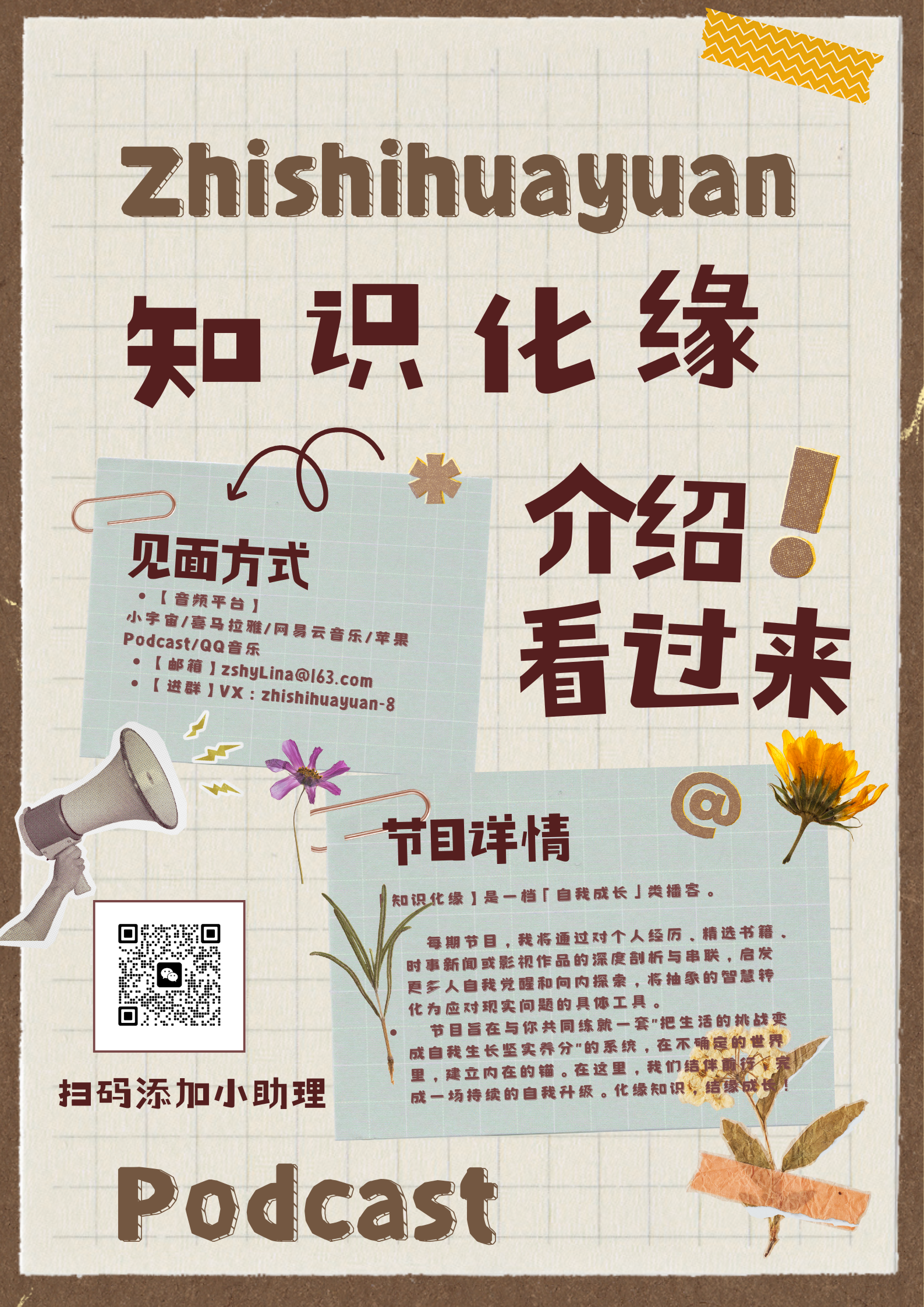 或许有些笨拙;或许有些不自然;或许会有些普通话不标准......还请您见谅!我会慢慢进步,就像我们的Slogan:“化缘知识,结缘成长”我们一起跟着这档播客进步和成长!