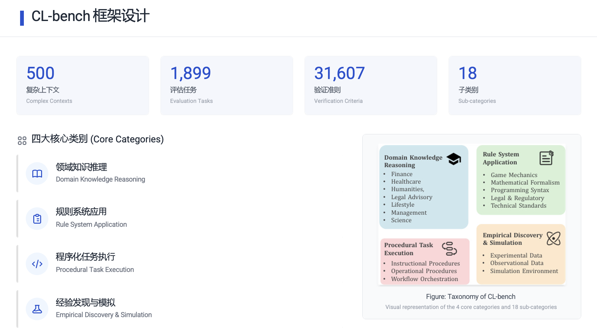 为了系统评估这一能力,研究者构建了 CL-bench,它不同于任何现有的、偏向检索或理解的“长文本”测试。