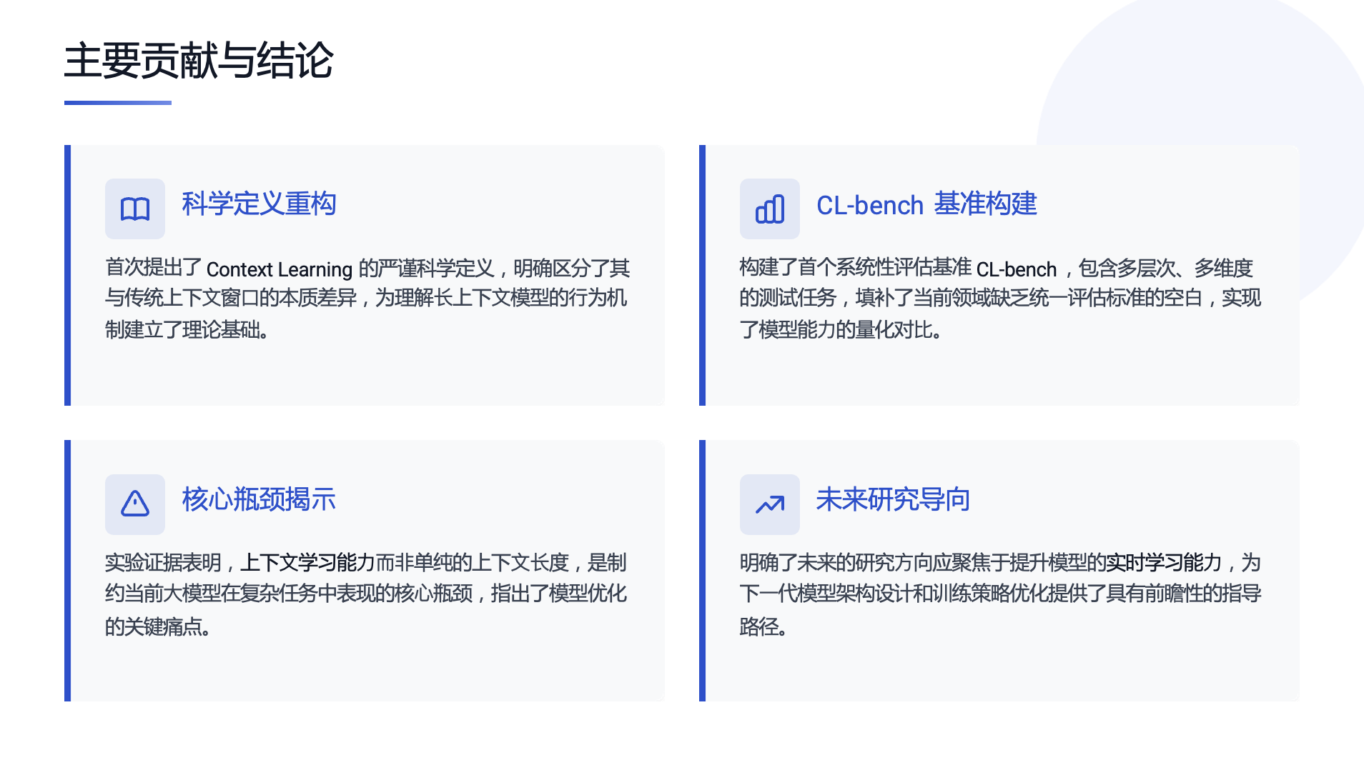 - 与“情境学习”的本质区别:传统的情境学习(In-Context Learning)是让模型通过几个例子,“猜”出你想要它做什么(任务格式)。而背景学习是让模型 “学”会一套它从未见过的知识内容,并加以应用。这对模型的归纳、推理和知识整合能力提出了更高要求。
