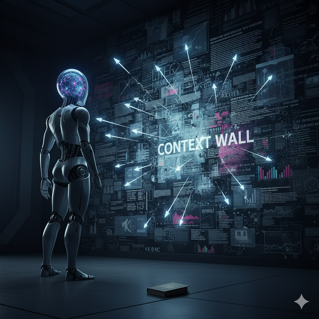 封面提示词:A visual metaphor of a powerful but confused AI. A sleek, humanoid AI robot stands before a massive, intricate wall covered in dense text, complex diagrams, legal paragraphs, and data charts — this is the “Context Wall”. The robot's head is a transparent dome, showing its internal neural network glowing, but it has multiple arrows pointing from the network to the wall, all hitting the wall and fracturing or bouncing off, symbolizing failure to integrate. One small arrow barely pierces through a tiny section. In the foreground, a simple textbook lies ignored on the floor. The style is conceptual, cinematic, and slightly futuristic, with a mood of facing a formidable, unsolved challenge.
