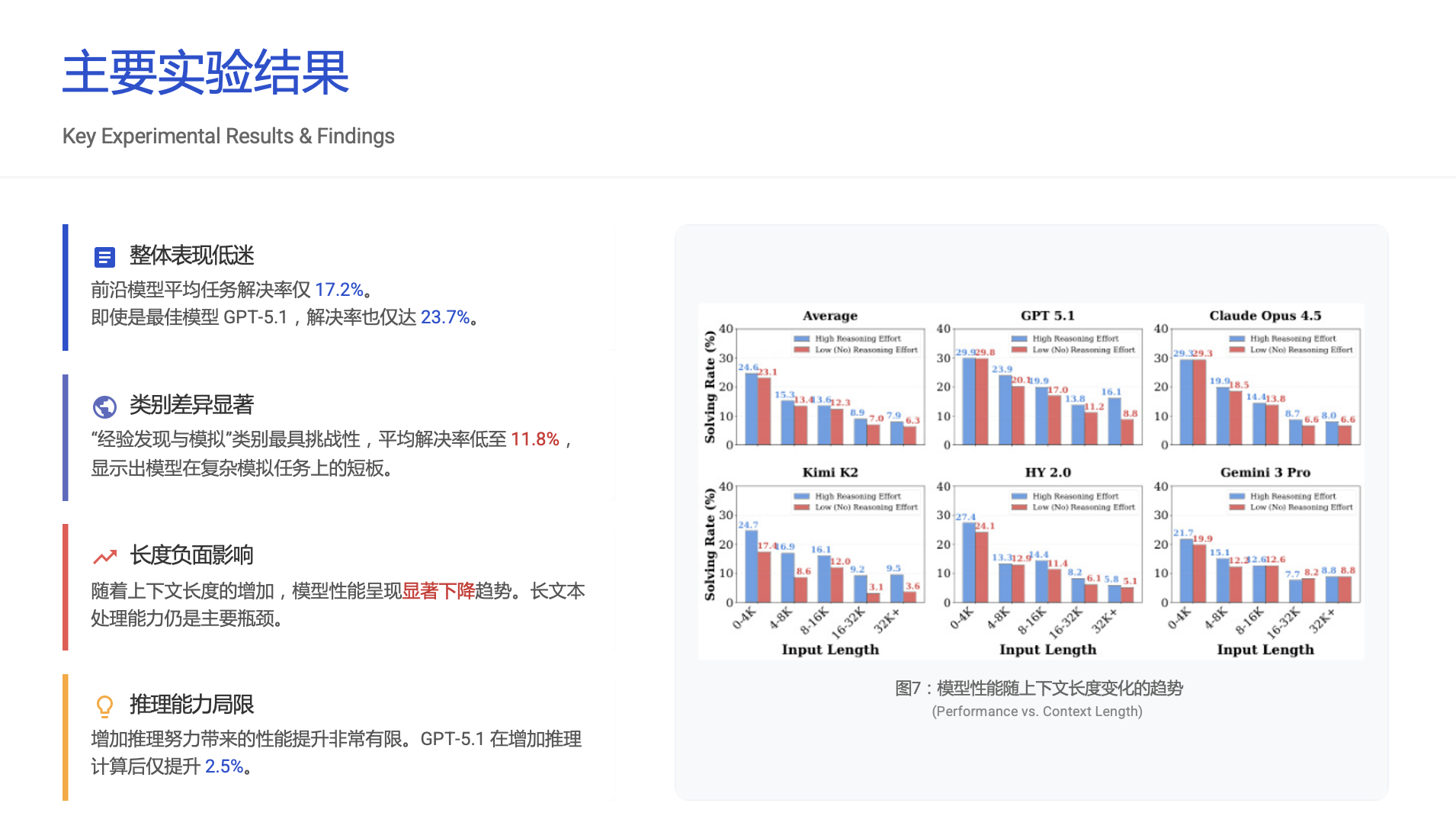 - 长上下文仍是噩梦:随着输入上下文长度的增加,所有模型的性能都显著下降,处理和理解超长文本的能力依然是硬伤。