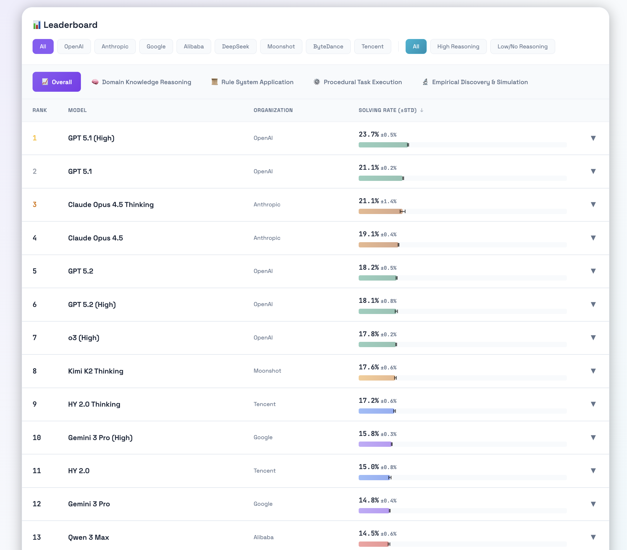 - 整体表现低迷:所有模型的平均任务解决率仅为17.2%。表现最好的 GPT-5.1 也仅达到23.7%,这意味着超过四分之三的复杂现实任务模型无法有效处理。