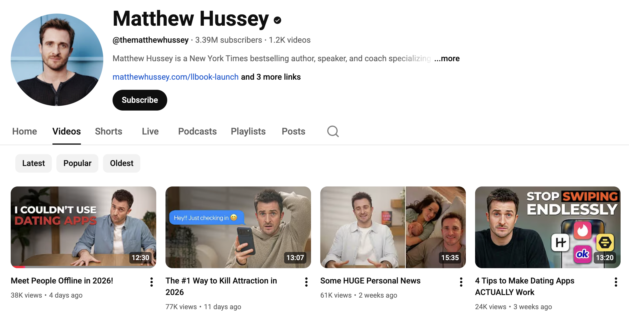 爱情教练 Matthew Hussey 的频道(图片来源:YouTube)