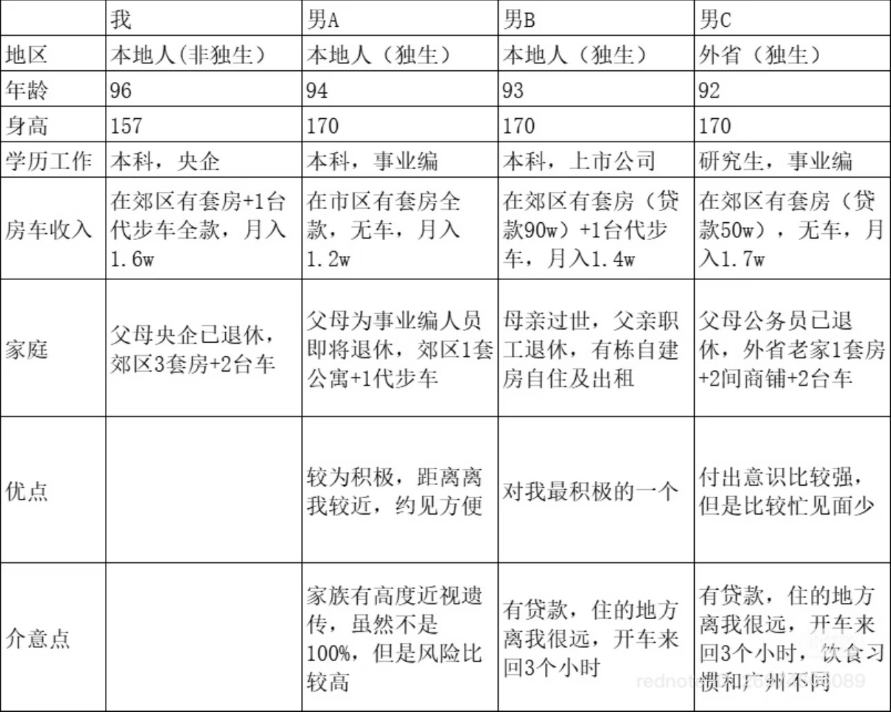 相亲表格例子(图片来源:小红书)