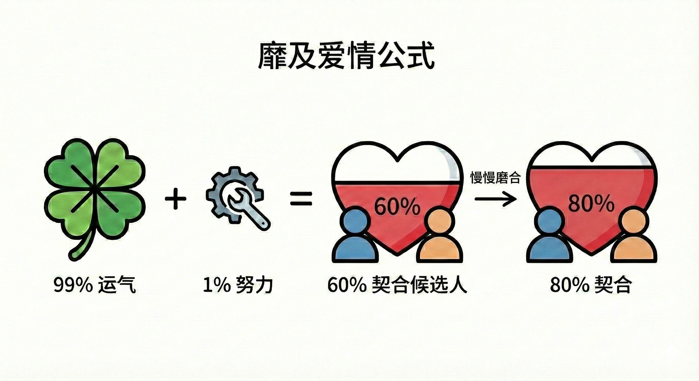 04:56 靡及的爱情公式:99%运气 + 1%努力 = 一个 60% 契合的候选人慢慢磨合到 80%