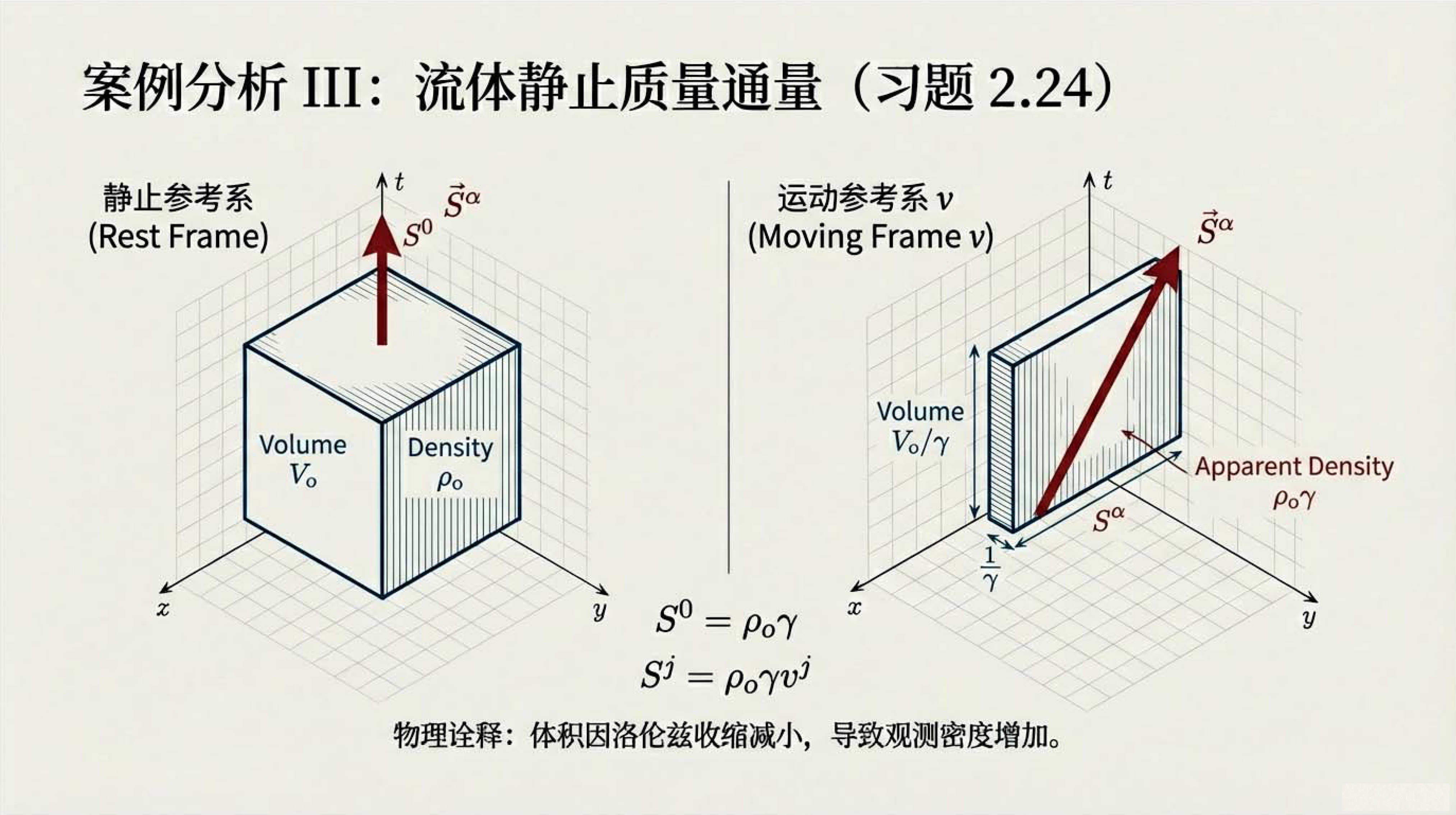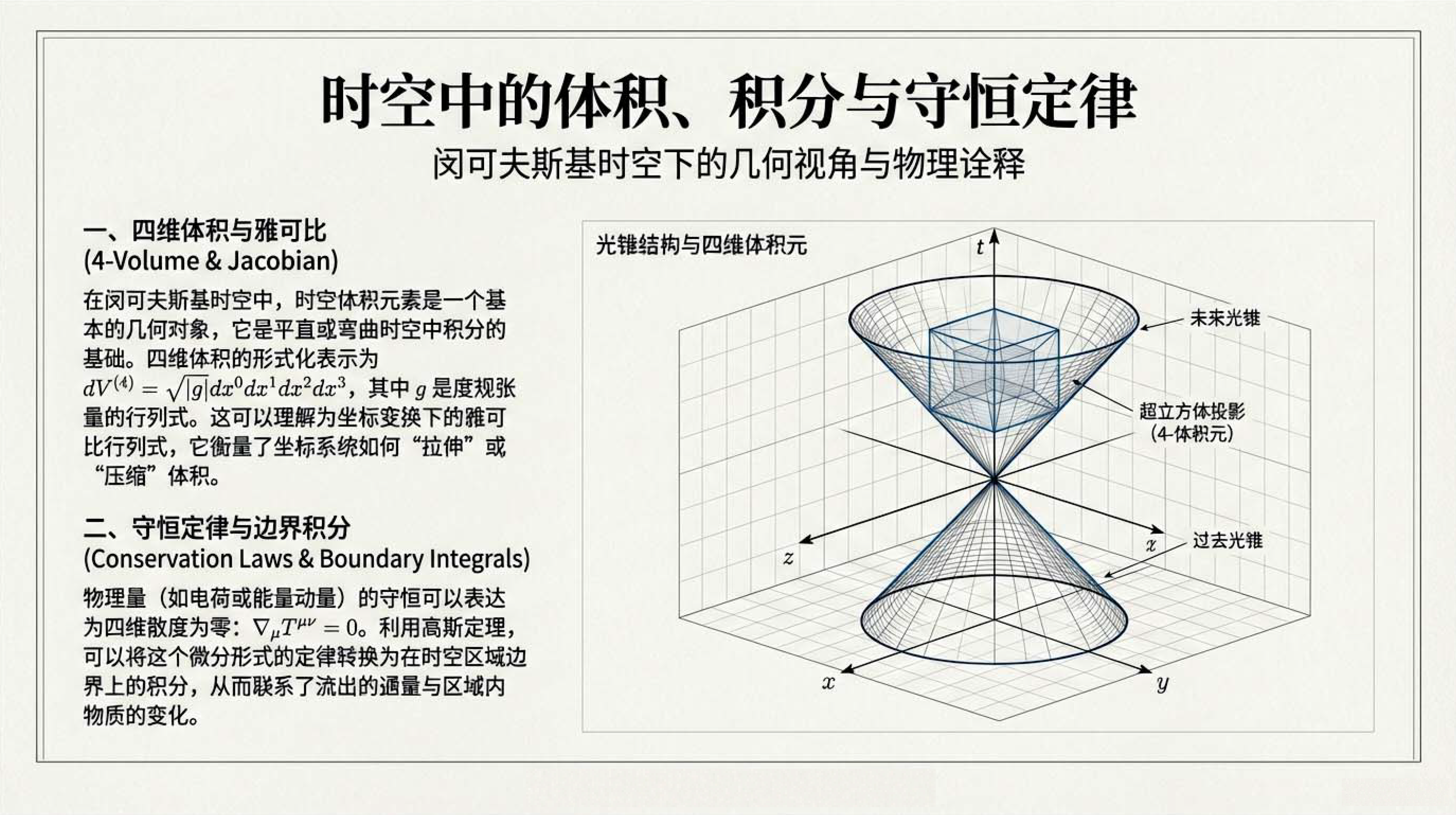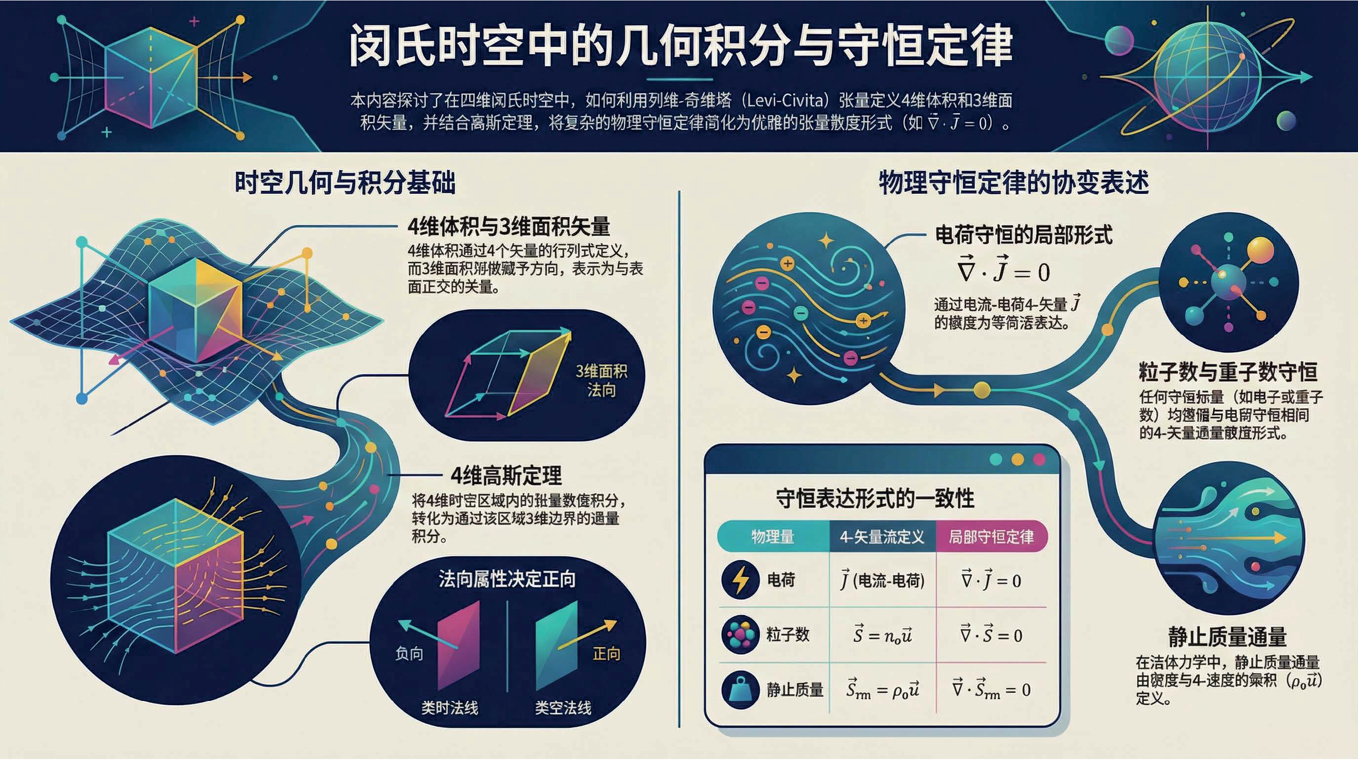 本课探讨了闵氏时空中的体积、积分与守恒定律。利用列维-奇维塔张量定义了四维体积和三维体积矢量,。通过时空高斯定理,将电荷、粒子数及静止质量的全局守恒定律转化为局部微分形式。这些工具对于理解相对论流体动力学至关重要。