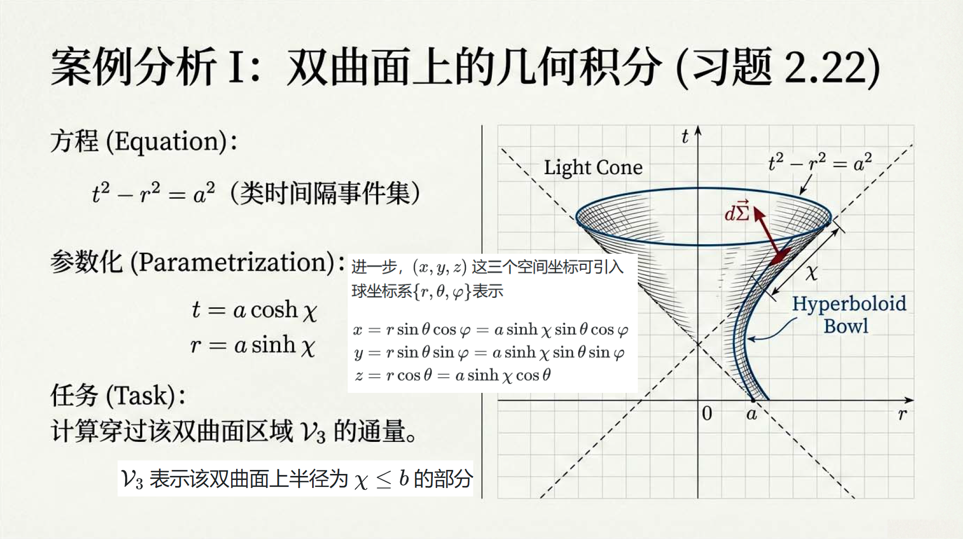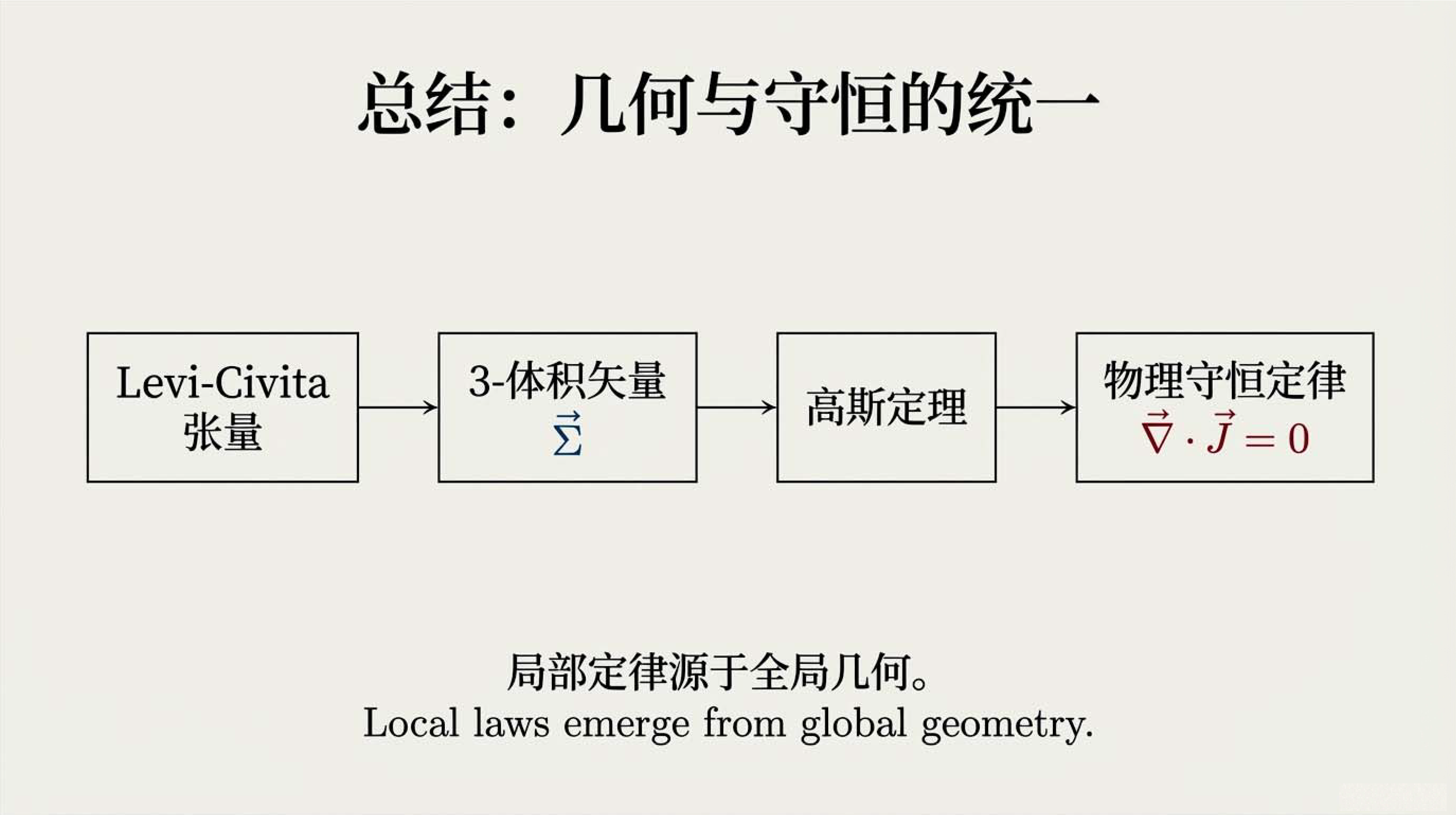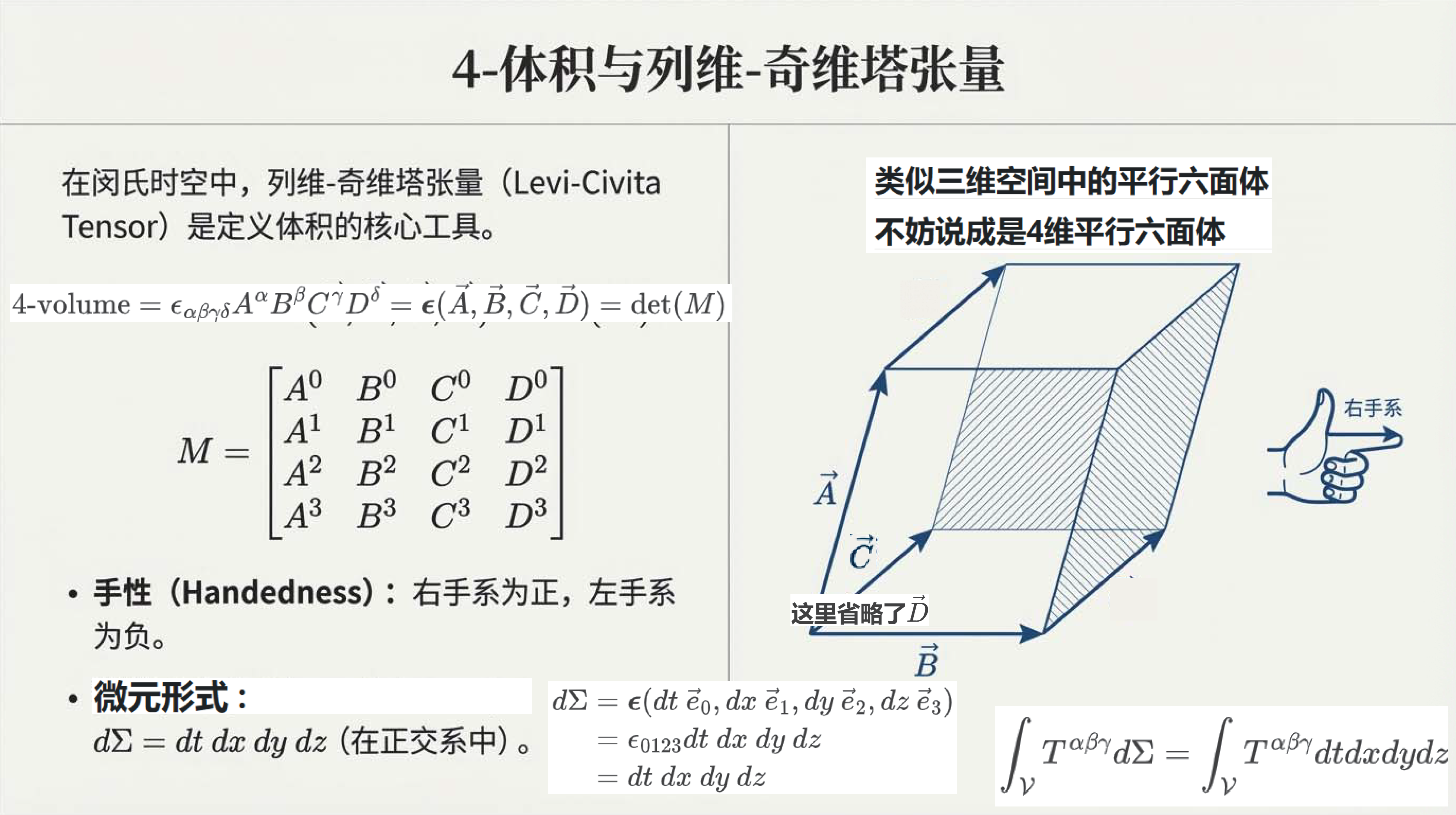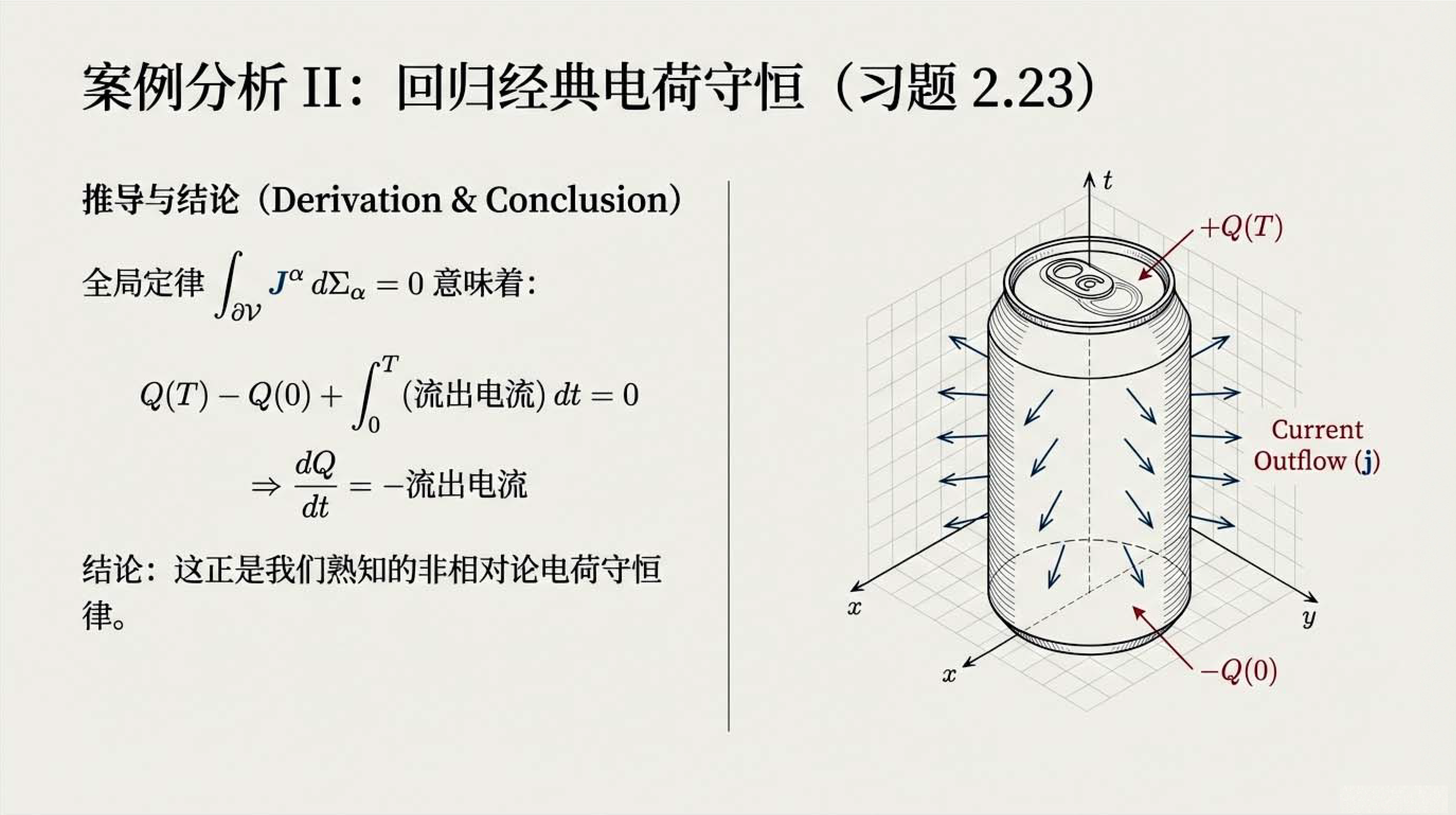 本课探讨了闵氏时空中的体积、积分与守恒定律。利用列维-奇维塔张量定义了四维体积和三维体积矢量,。通过时空高斯定理,将电荷、粒子数及静止质量的全局守恒定律转化为局部微分形式。这些工具对于理解相对论流体动力学至关重要。