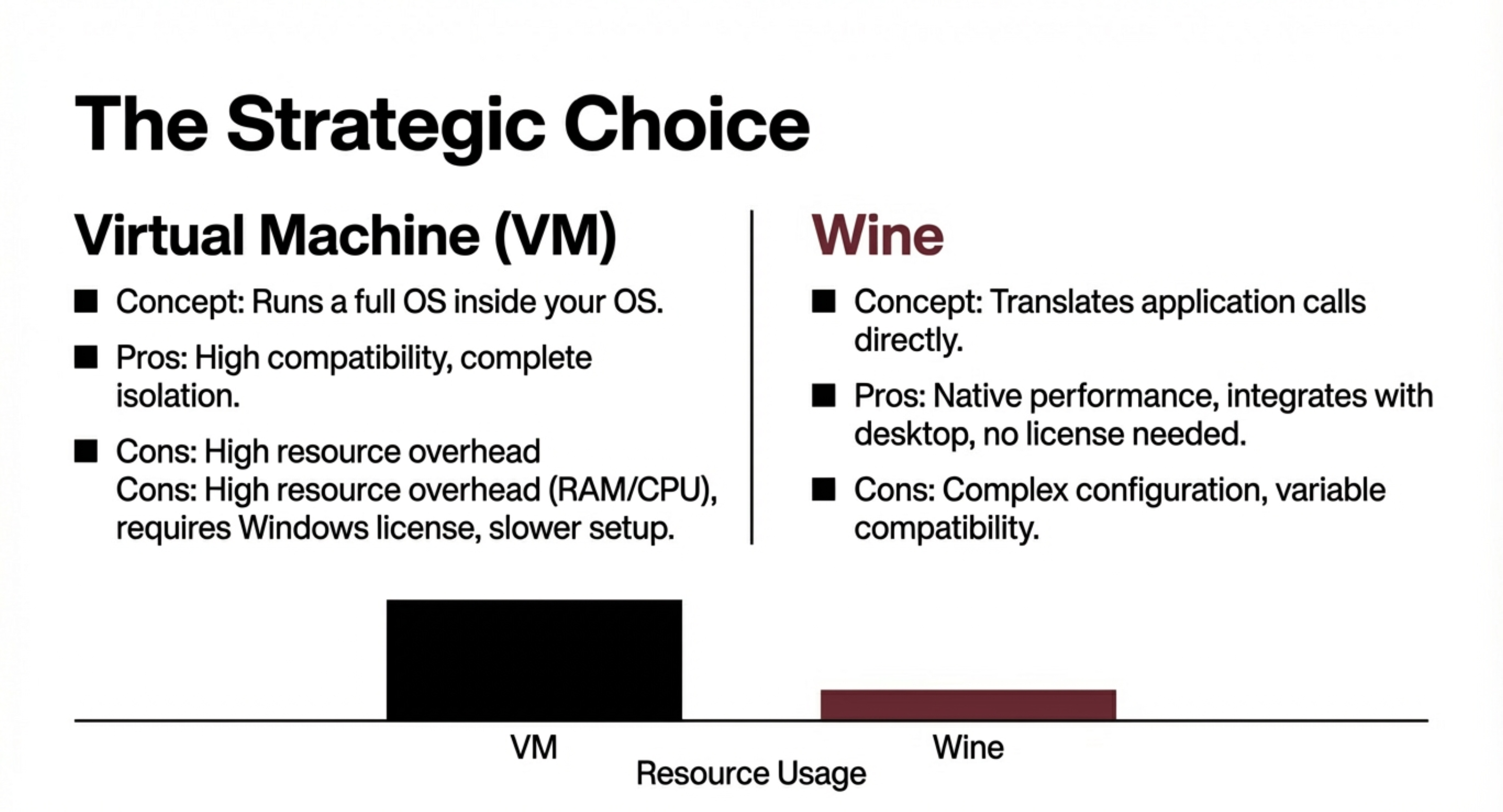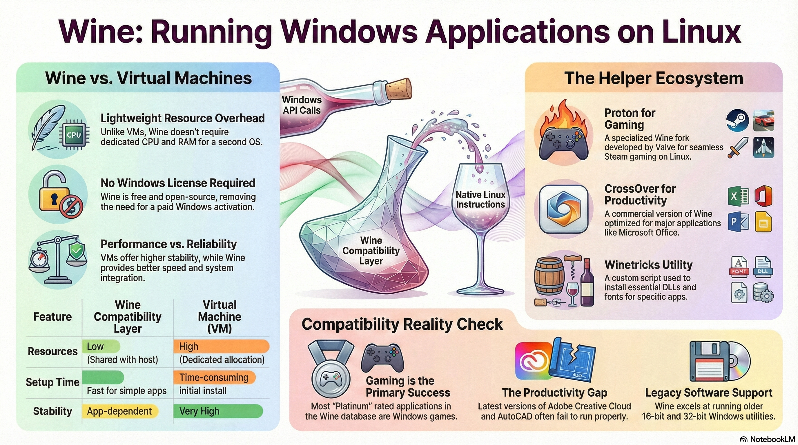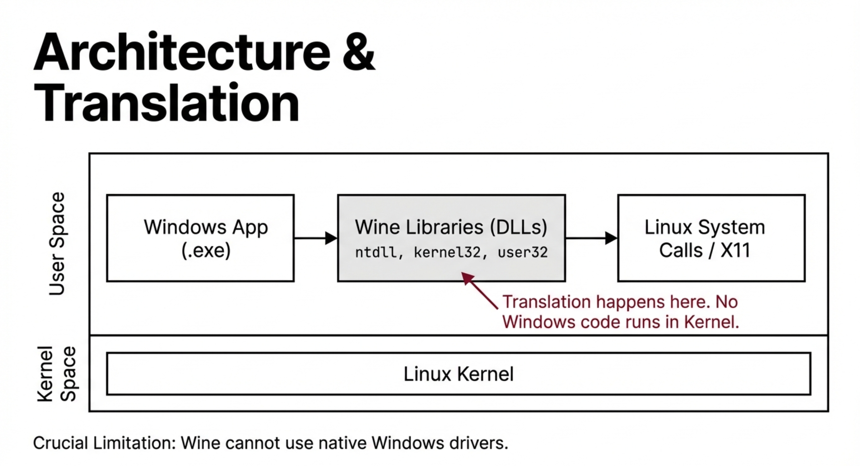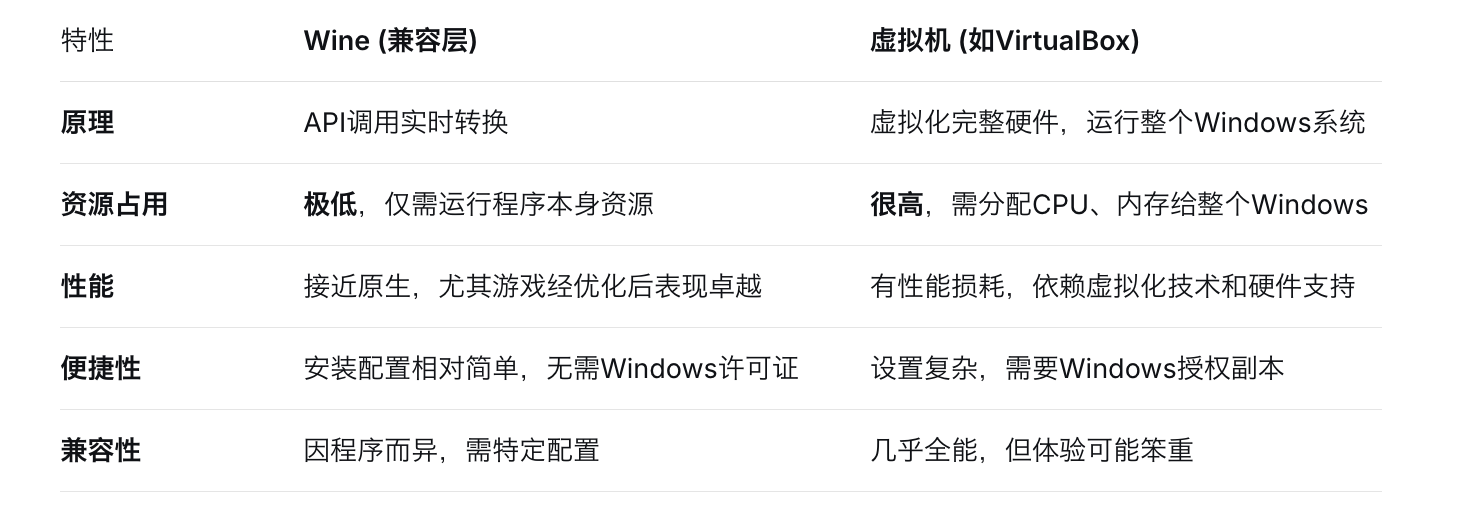 理解 Wine,首先要打破一个常见误解:它不是虚拟机,也不是处理器指令模拟器。