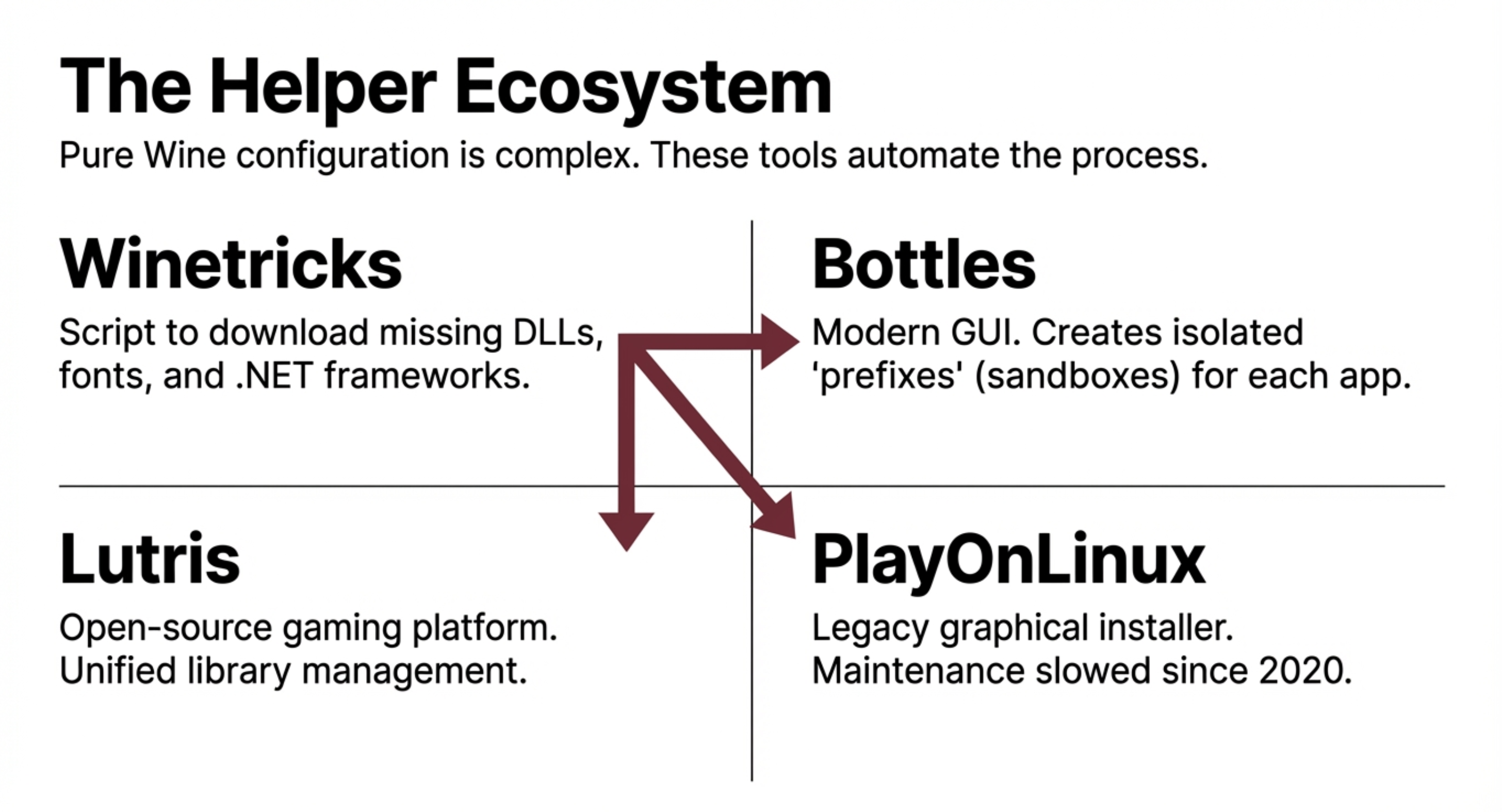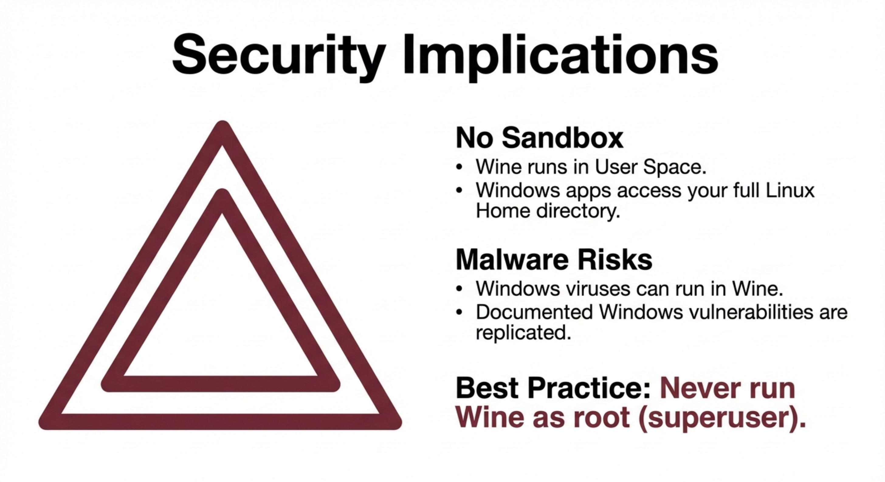Winetricks、Bottles、Lutris等优秀工具,帮助管理复杂的 DLL 依赖和创建独立的程序运行环境(前缀),让配置变得简单。 - 重要安全警告:永远不要以 root(超级用户)权限运行 Wine。因为 Wine 能执行 Windows 二进制程序,这意味着 Windows 病毒和恶意软件也有可能通过 Wine 在 Linux 上运行。请始终在普通用户权限下使用。