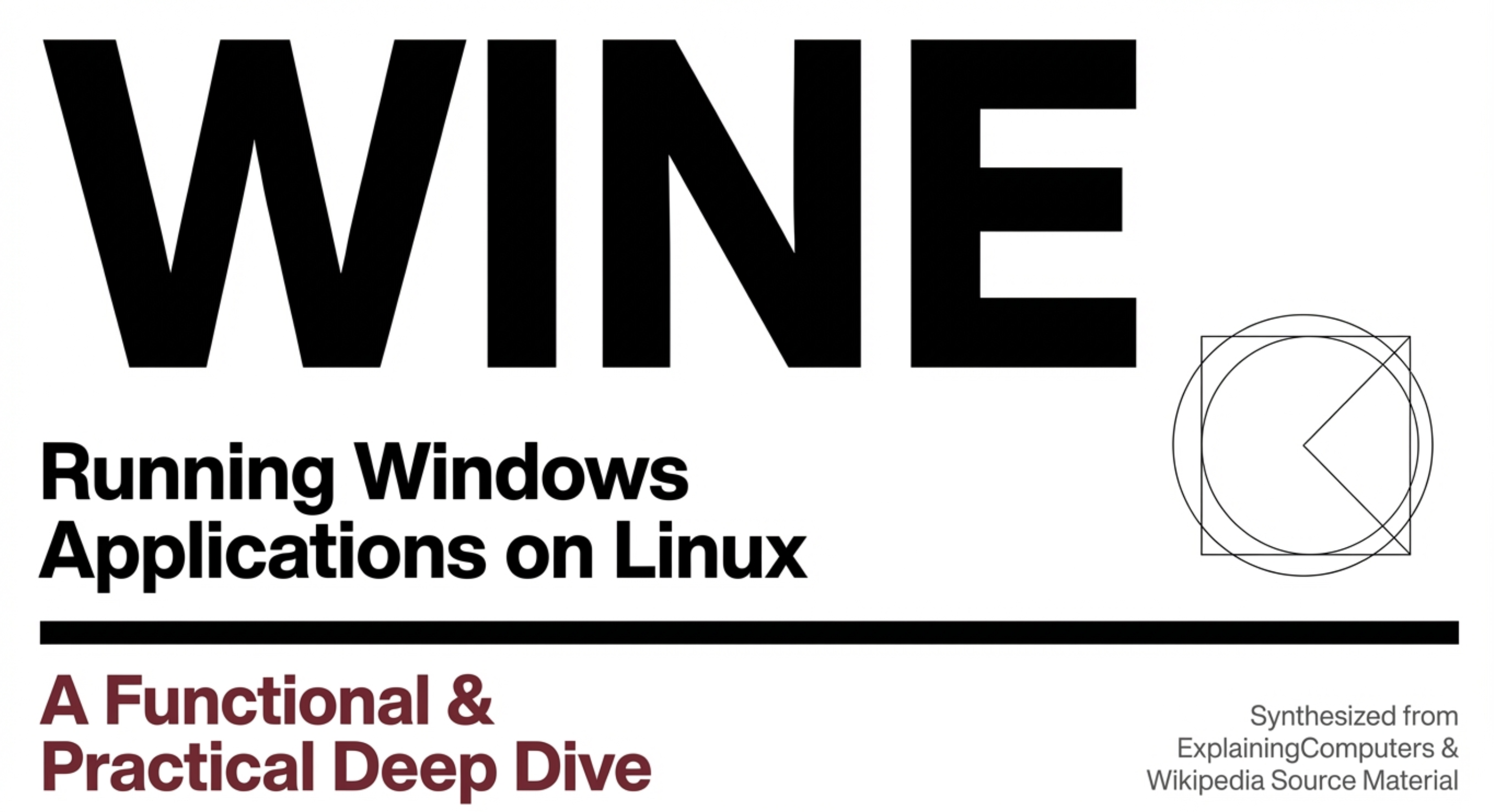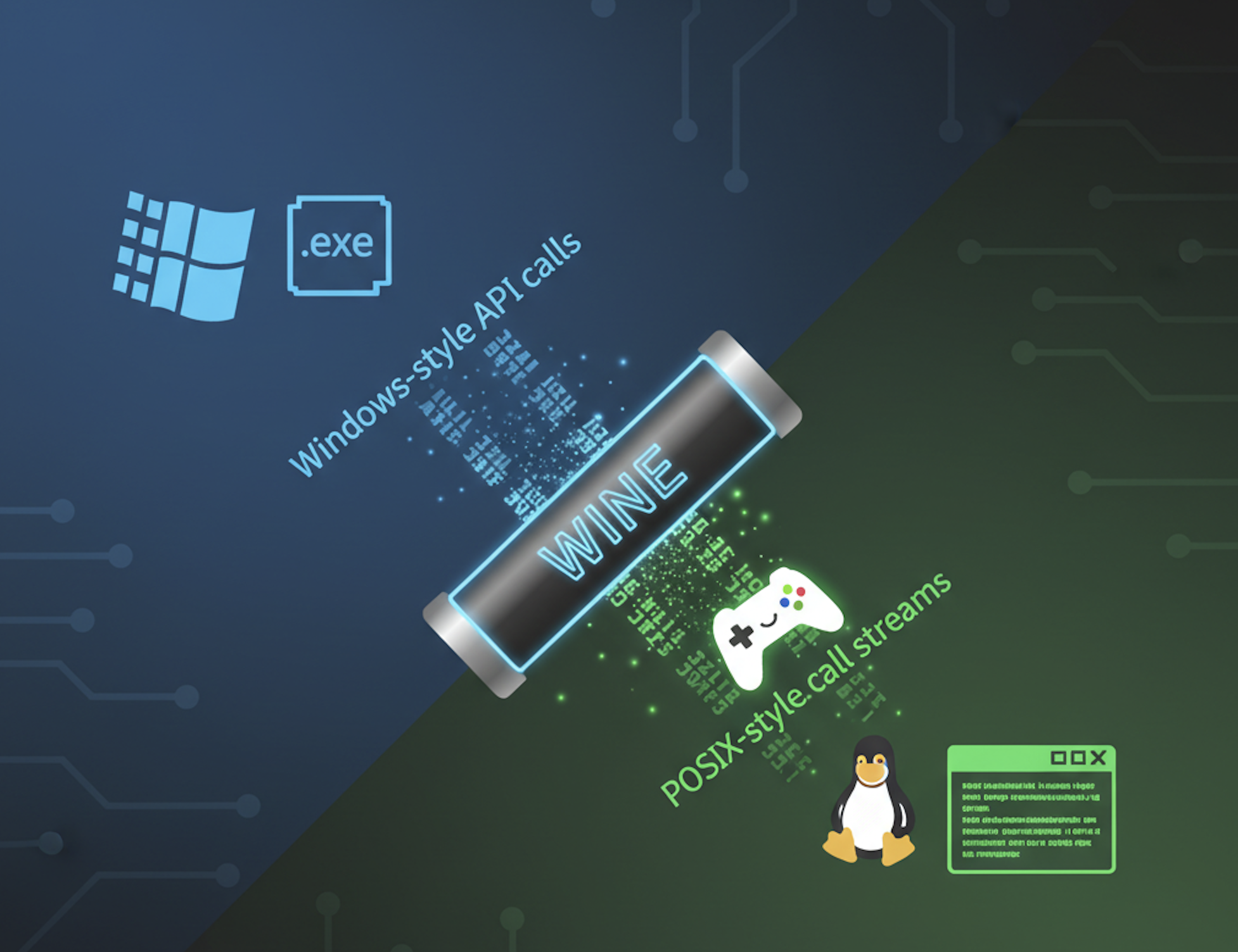 封面提示词:A clear visual metaphor of translation and compatibility. The image is split diagonally. The top-left section shows the familiar Windows logo and a classic .exe application icon. The bottom-right section shows the Tux penguin (Linux logo) and a terminal. Between them, in the center, a sleek, futuristic “translation module” or conduit is actively converting a stream of blue Windows-style API calls into green, POSIX-style call streams. The conduit is labeled “WINE”. One small, happy game controller icon smoothly rides the stream from left to right. The background is a subtle circuit board pattern. Style is modern, infographic-inspired, and clean, emphasizing the flow of conversion.