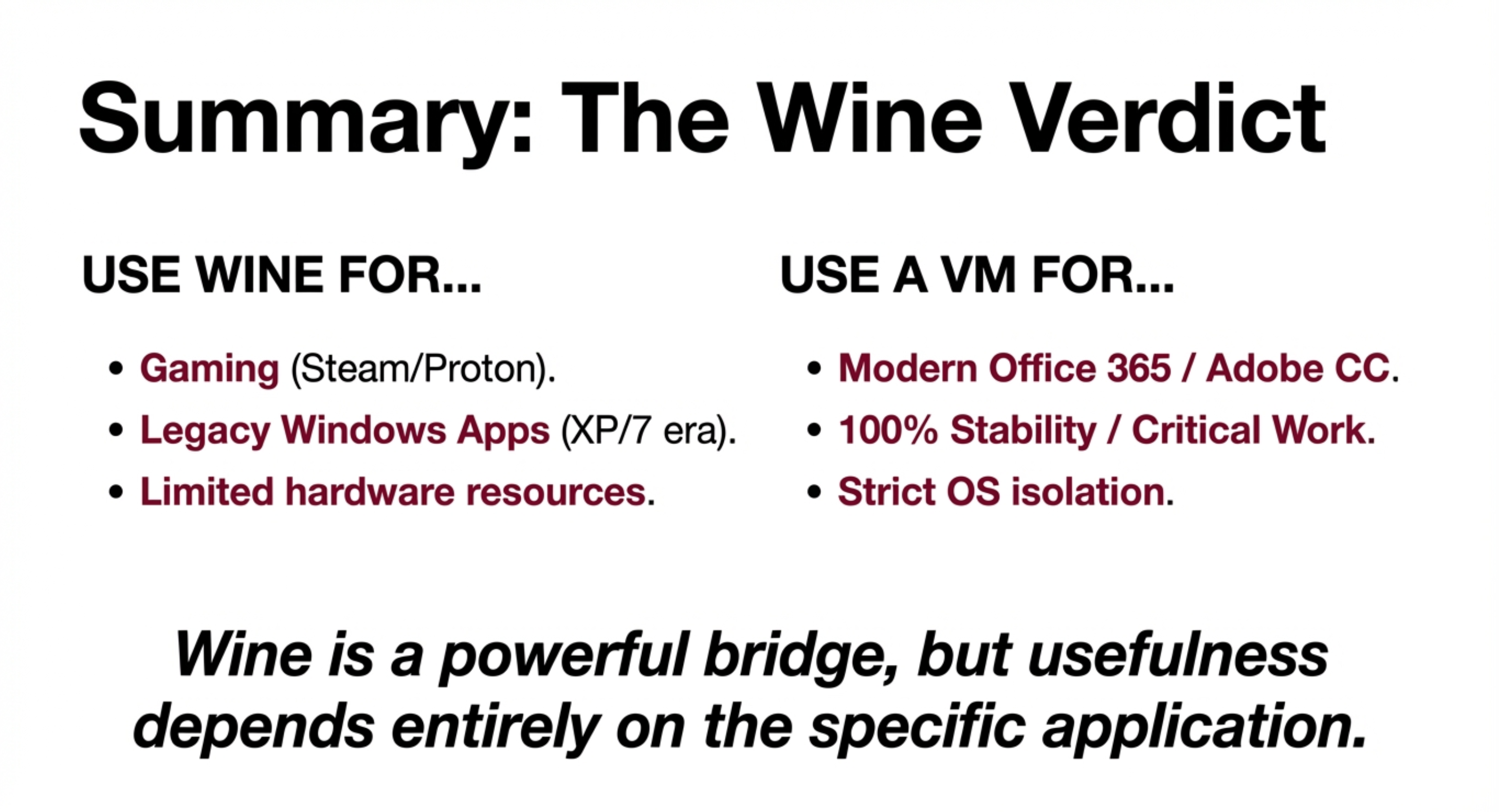 - 卓越的向后兼容性:得益于其转换架构,Wine 有时比 Windows 本身更“怀旧”。例如,它可以在64位 Linux 系统上运行古老的16位 Windows 程序,而这在64位原生 Windows 上已无法实现。