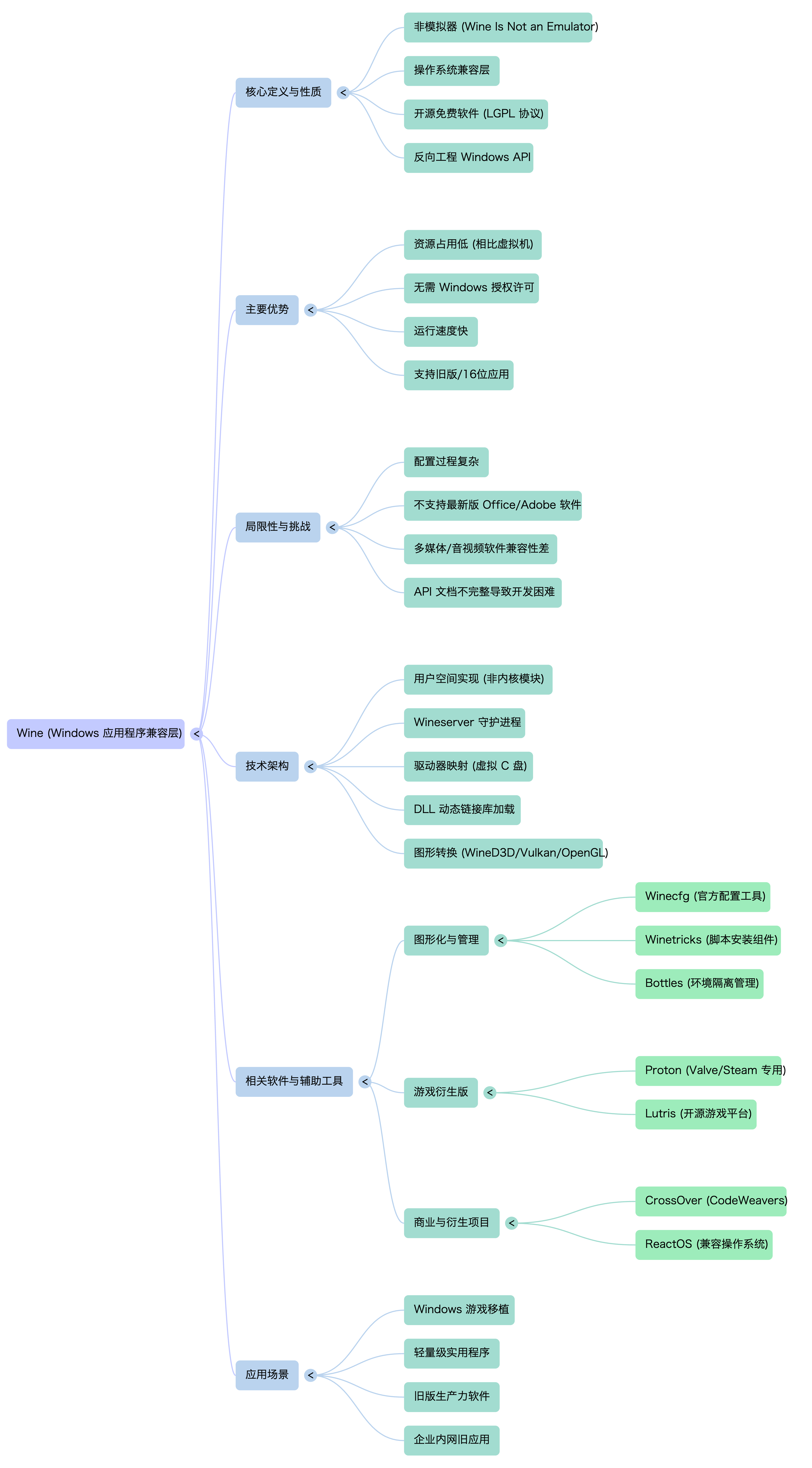 - 核心身份:兼容层:Wine 是一个在用户空间实现的、完整的 Windows 应用二进制接口(ABI)。它像一位实时翻译官,当 Windows 程序发出系统调用时,Wine 立刻将其“翻译”成 Linux/macOS 能理解的 POSIX 调用。程序以为自己运行在 Windows 上,实际上却是在直接调用宿主系统的功能。