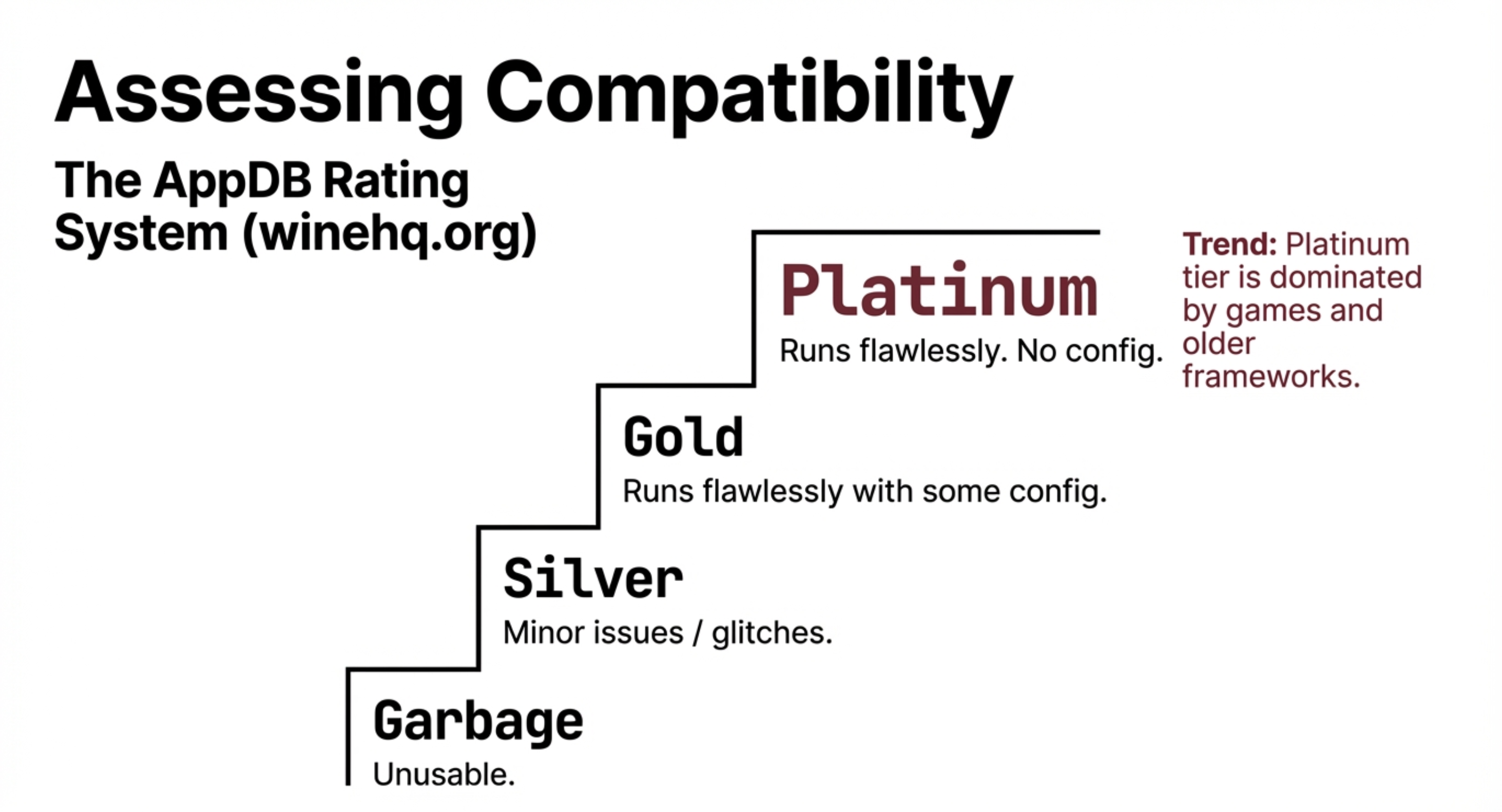 - 原生 Wine:上游核心项目。功能强大但配置繁琐,适合开发者和喜欢折腾的用户。