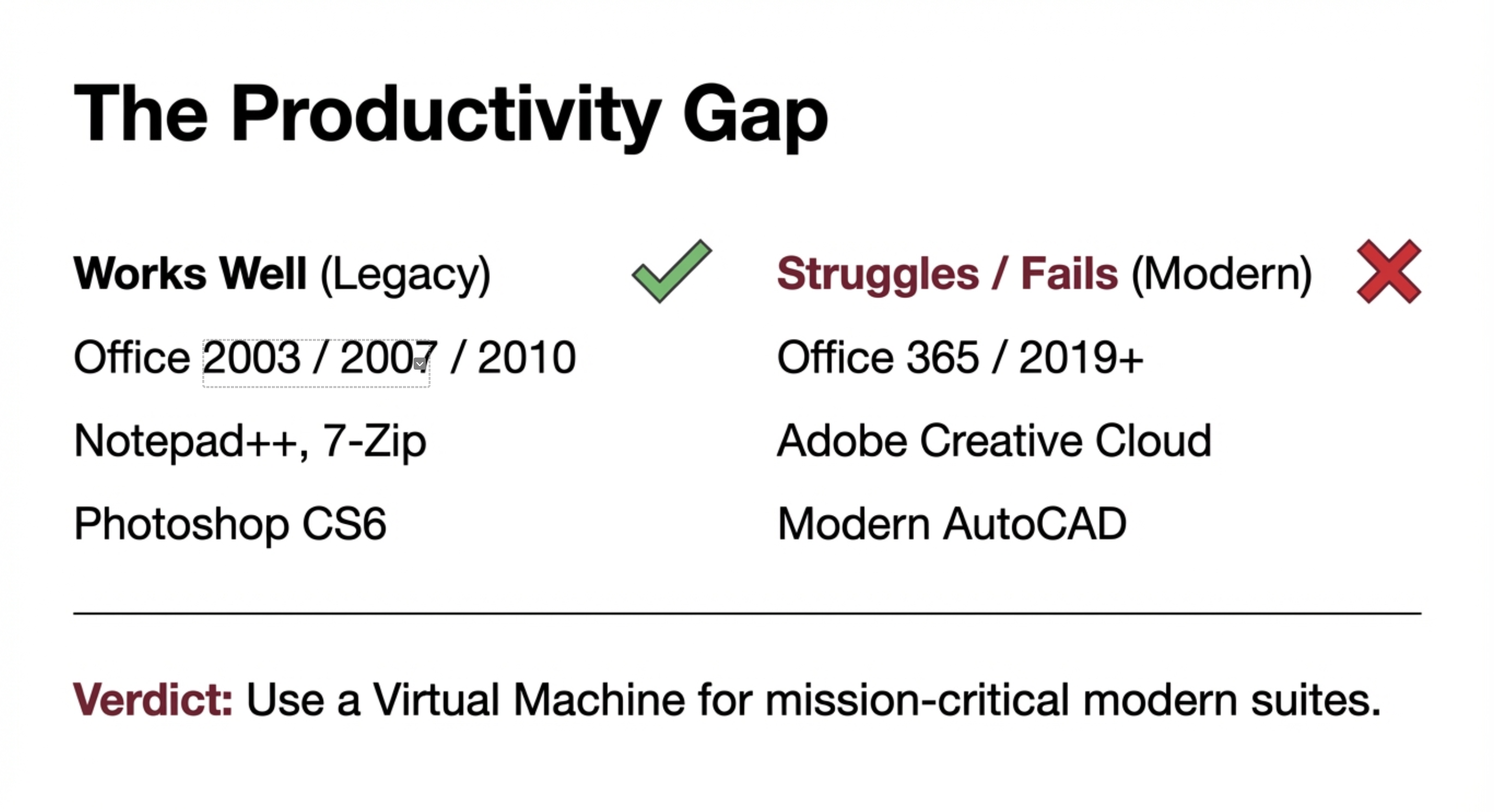 生产力软件:对老版本软件支持好。但对最新版的 Microsoft Office 365、Adobe Creative Cloud 等套件支持仍不完善,常功能受限或无法安装。 - 配置助手:社区创建了