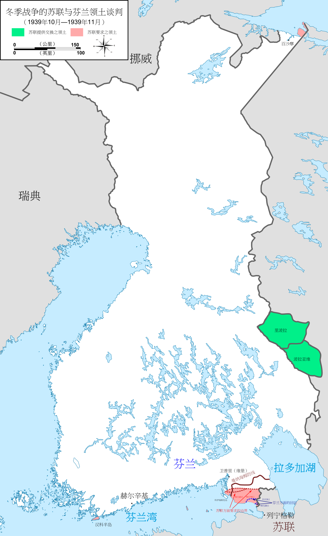 冬季战争的苏联与芬兰领土谈判地图