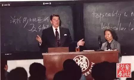▲ 里根在复旦大学的演讲,右侧为复旦大学校长谢希德