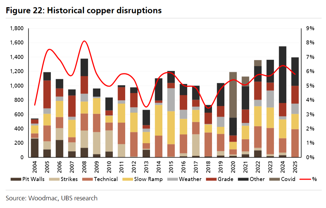 供应端的短板却持续凸显。2024-2025年铜矿扰动率超5%, Grasberg、Kamoa Kakula等核心矿山问题频发(图22,研报P13),导致2026年矿产供应增长预计不足1%,远低于3%左右的需求增速。