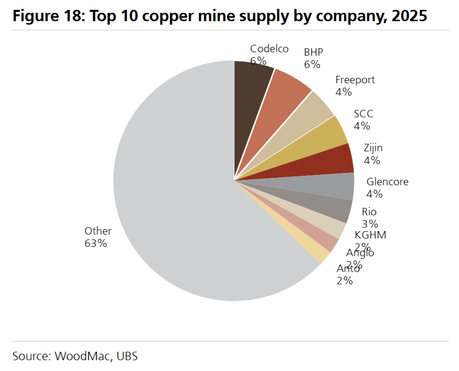 铜被称为“铜博士”,是全球经济的晴雨表,其高导电、耐腐蚀的特性使其成为电力、建筑、交通领域的刚需材料。2025年全球精炼铜产量约2800万吨,其中原矿供应2300万吨、二次供应500万吨,但采矿环节已成为产能瓶颈,全球400多家铜矿中,前10大生产商仅占40%市场份额(图18,研报P10),智利、刚果(金)、秘鲁合计贡献近50%矿产供应,供应格局高度集中且脆弱。