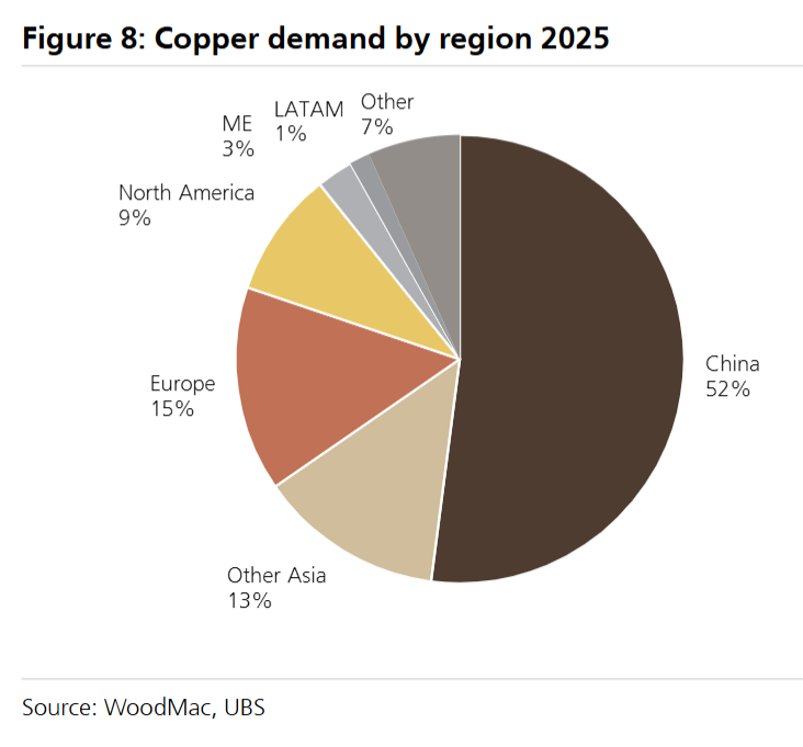 需求端早已暗流涌动。中国占全球铜需求的52%,欧洲、北美分别占15%和9%(图8,研报P6),电力基础设施和建筑各占需求的25%,而能源转型正成为核心增长引擎。