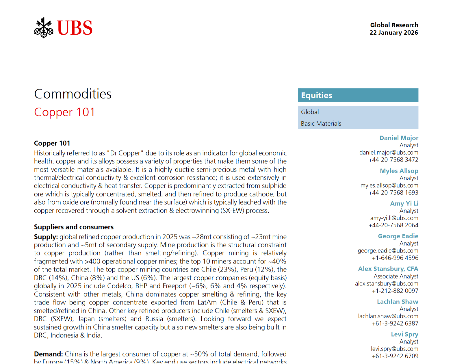 瑞银2026年1月22日发布的《Commodities Copper 101》研报,直指铜市场供需失衡的核心矛盾——能源转型驱动需求激增,而供应增长近乎停滞,2026年起全球铜市场将进入持续性短缺,这一趋势比想象中更猛烈。