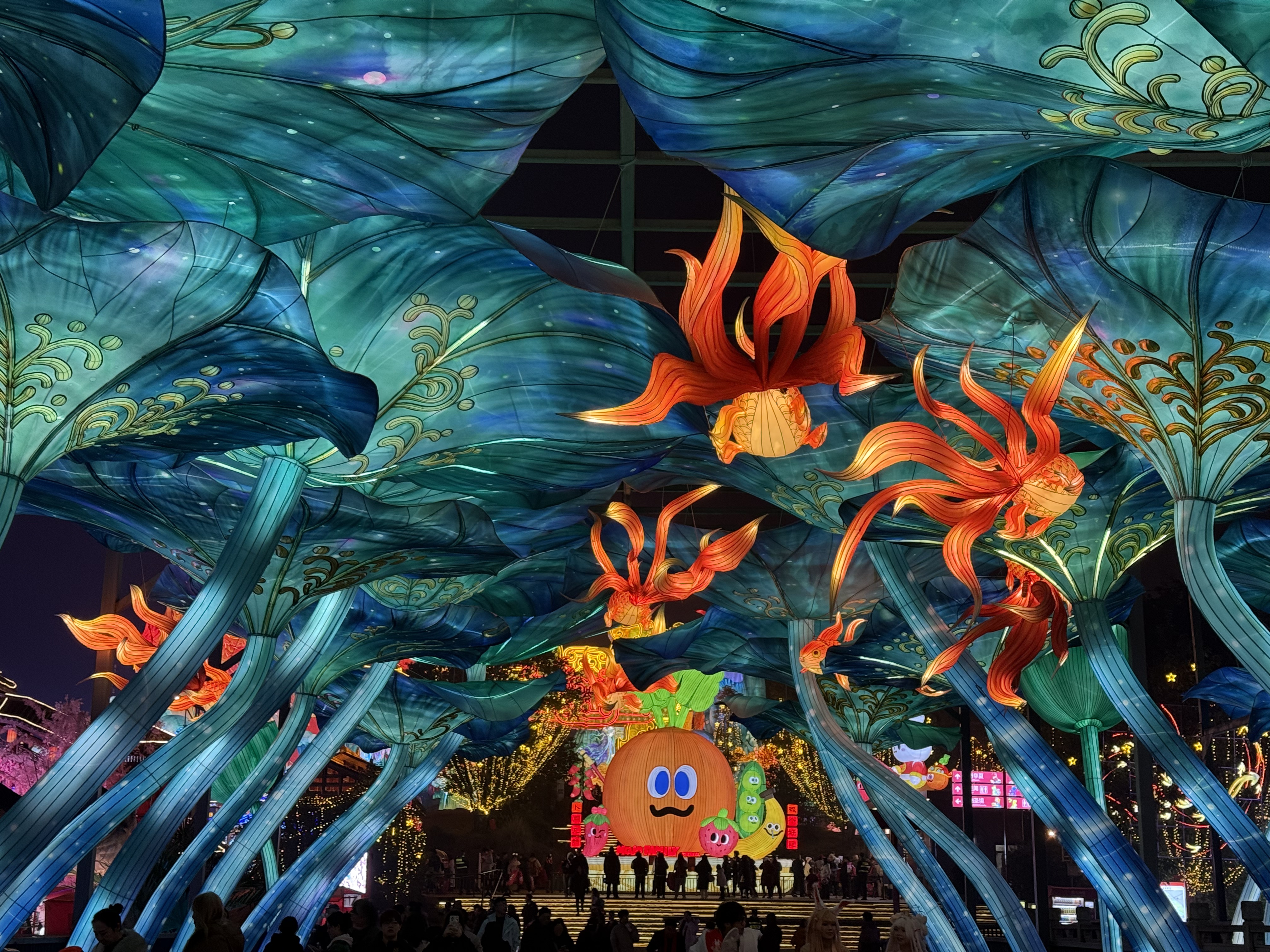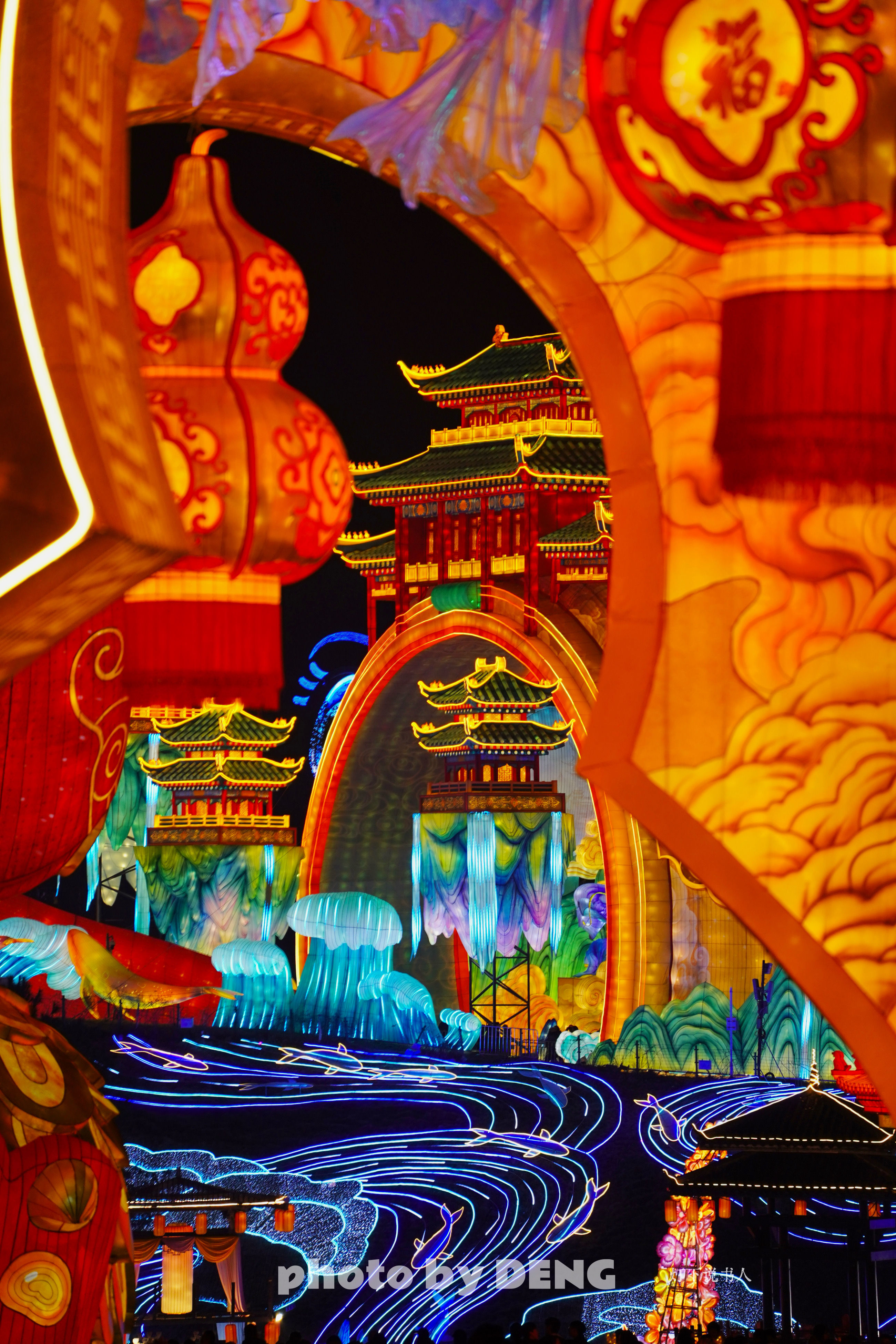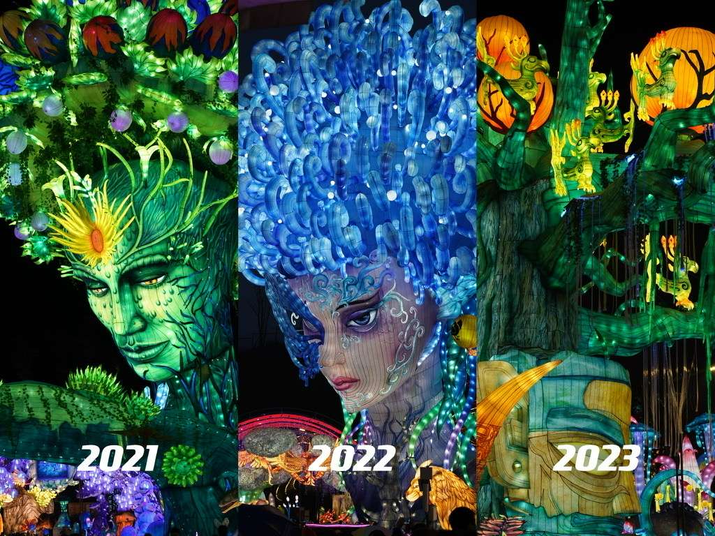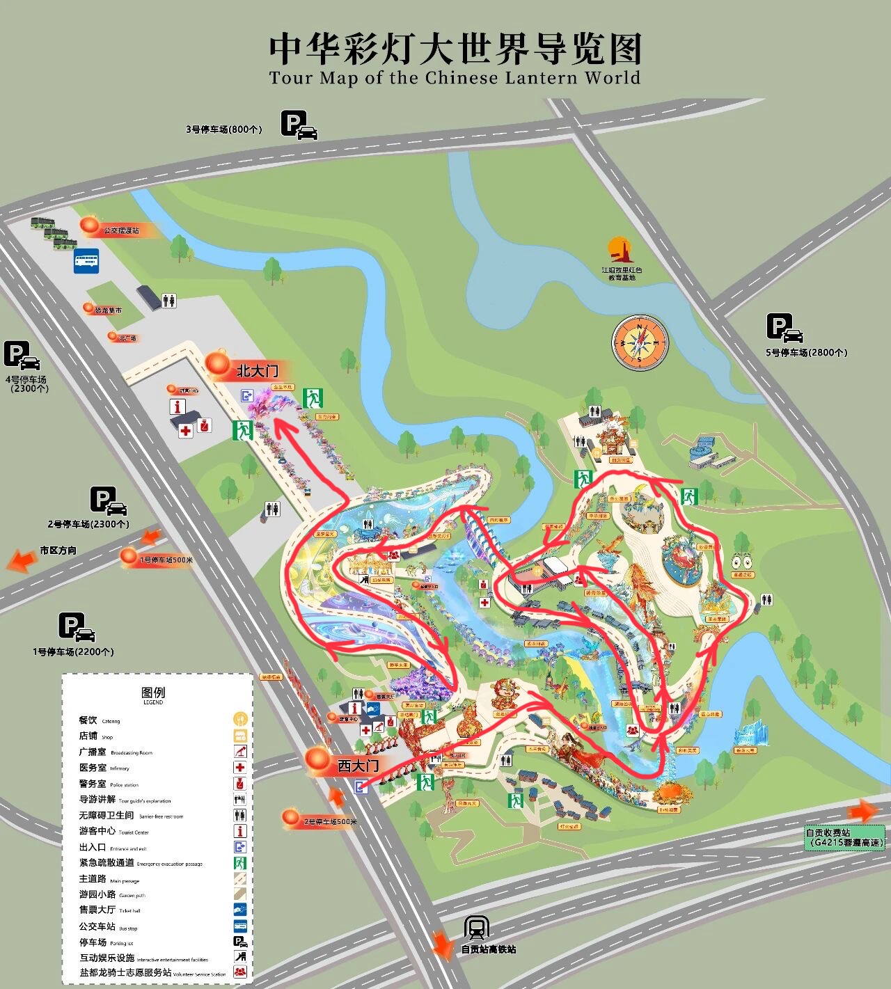 大门→福禄双至→福娃→福娃背后露台看鲲鹏→(右拐)木兰传奇→柿柿如意→(过桥)荷荷美美→五月天卜卜→非遗匠心→王者荣耀→童趣之眼→乐创国潮→盐街灯市→神奇华夏→(过桥)四时有序→创想美灯汇→川超雄起→畅想未来→生生不息
