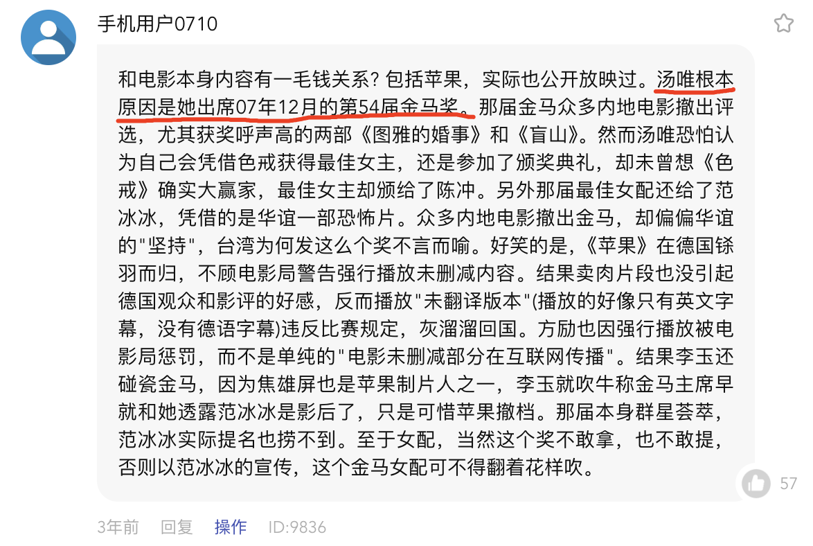 此前评论区有网友质疑汤唯被封杀的真正原因是和金马奖有关